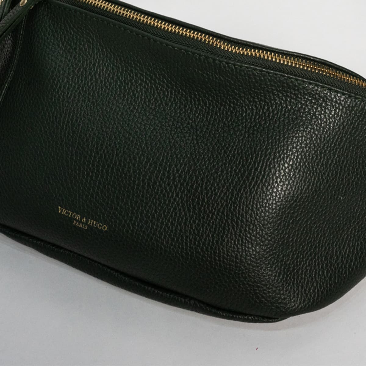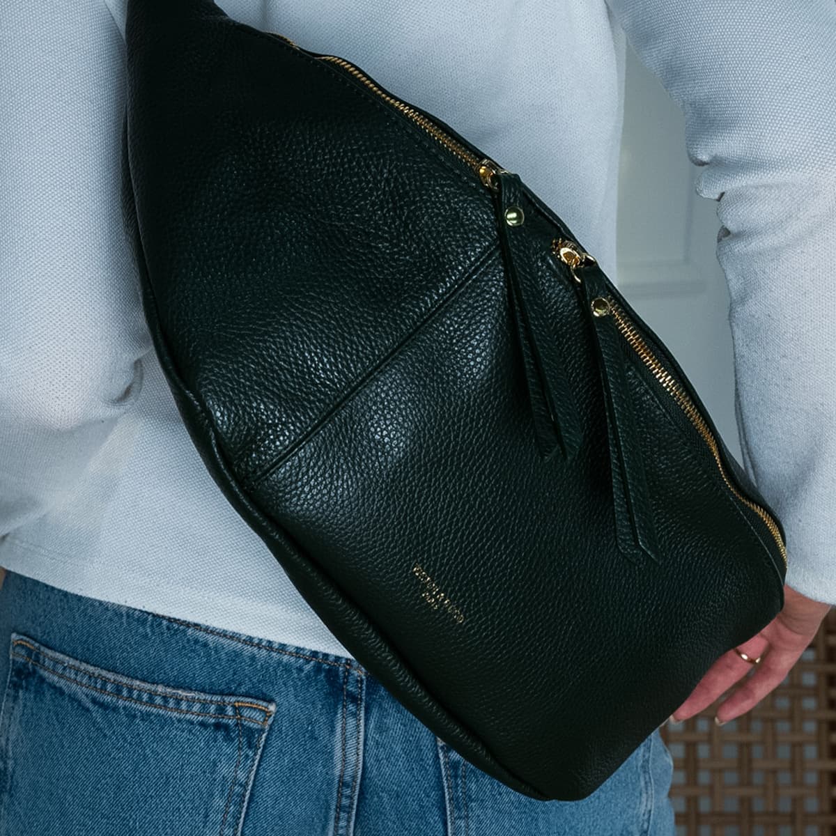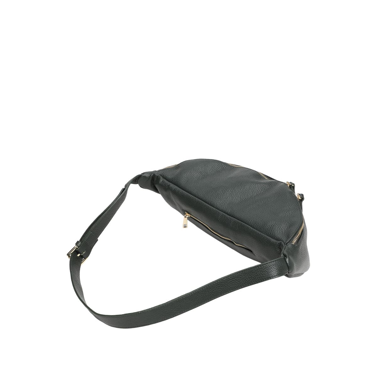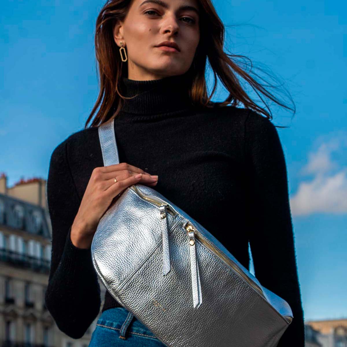 Sac banane en cuir Alia composé de 2 poches avec un zip sur le devant dont une grand poche avec compartiment centrale.Une poche zippée à l’intérieur ainsi qu’une poche zippée sur l’arrière. Une grande anse réglable. Bijouterie dorée. Sac entièrement doublé.