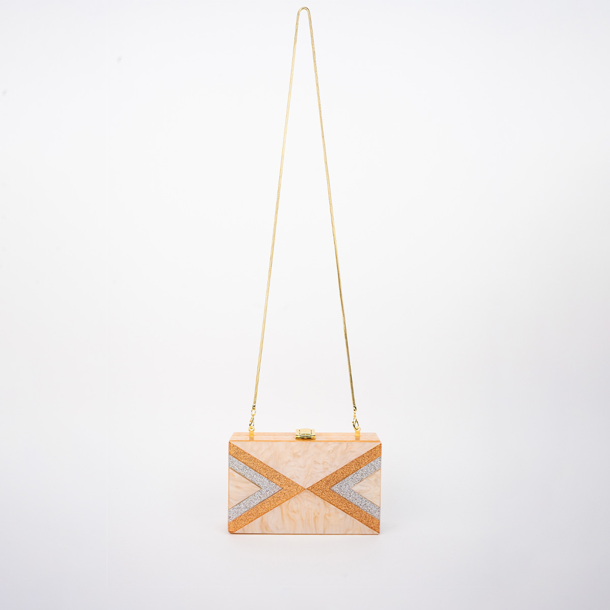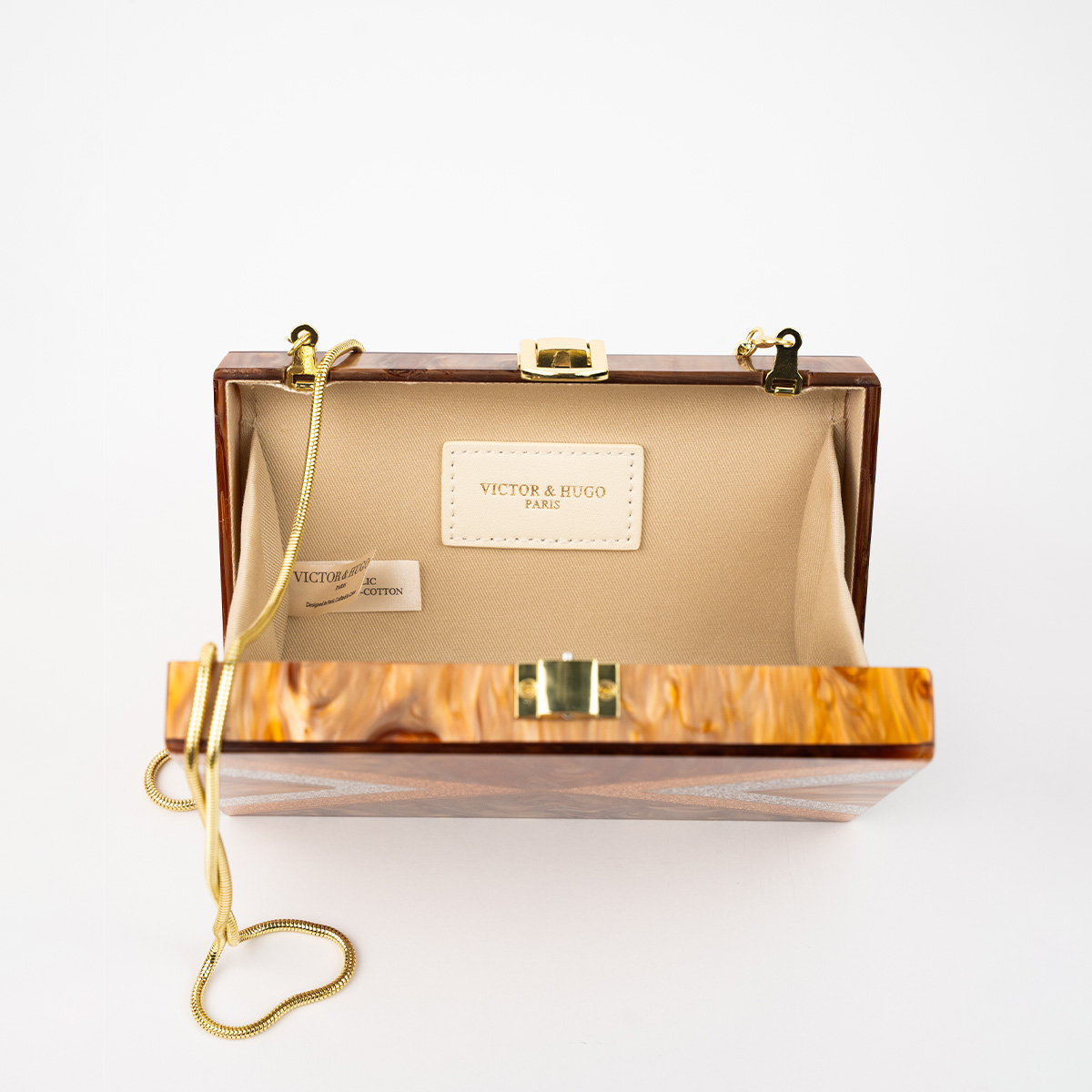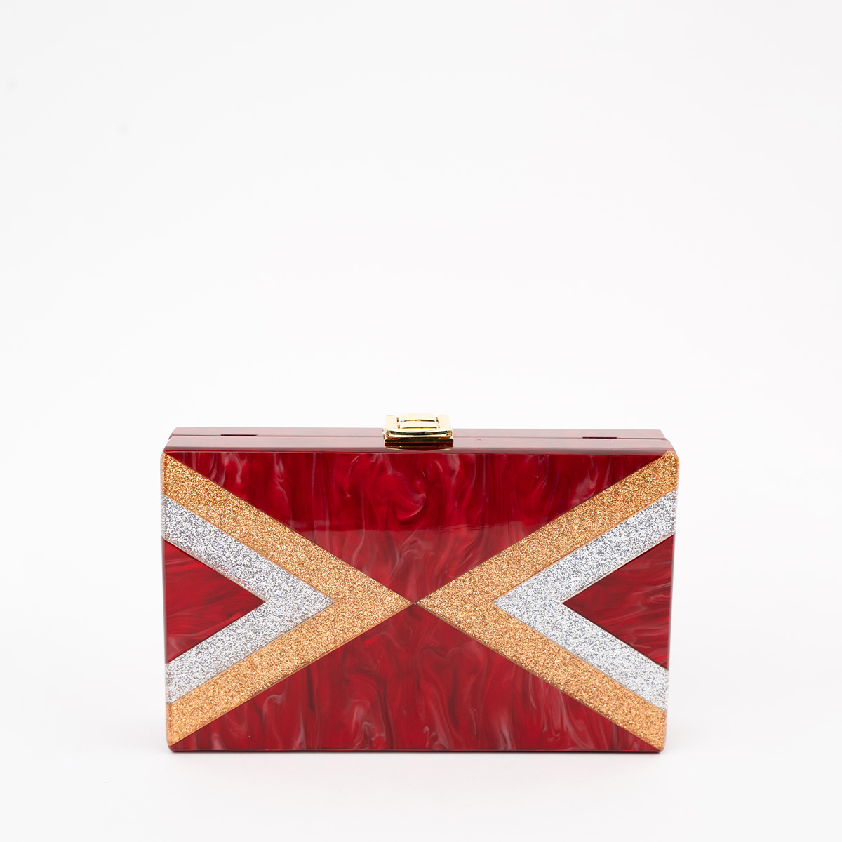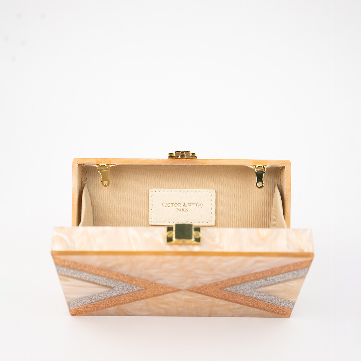 Le sac Crysta séduit par on design graphique audacieux et son aspect nacré.Son format rectangulaire structuré et entierement réalisé en acrylic effet marbré avec un motif géométrique en paillettes sur la face avant offrant un jeu de lumire élégant et festif.Il se ferme grace à un fermoir en métal doré situé sur le dessus.Le sac est entièrement doublé de polyester pour protéger vos effets personnels.Le modèle est accompagné d’une bandoulière amovible pour un porté croisé.Un accessoire chic et moderne idéal pour sublimer une tenue de soirée ou ajouter une touche de glamour à une silhouette plus minimaliste.