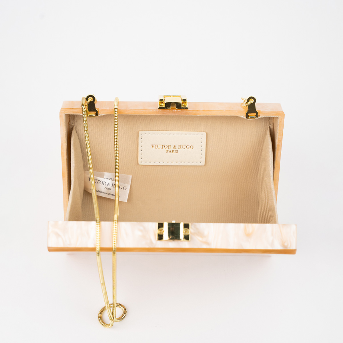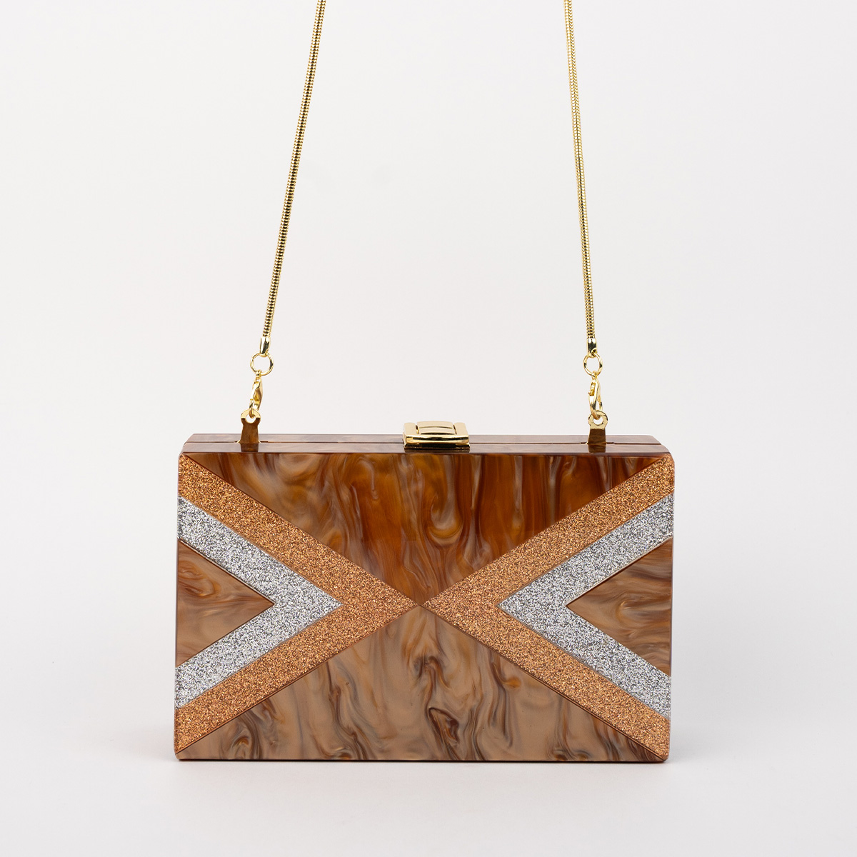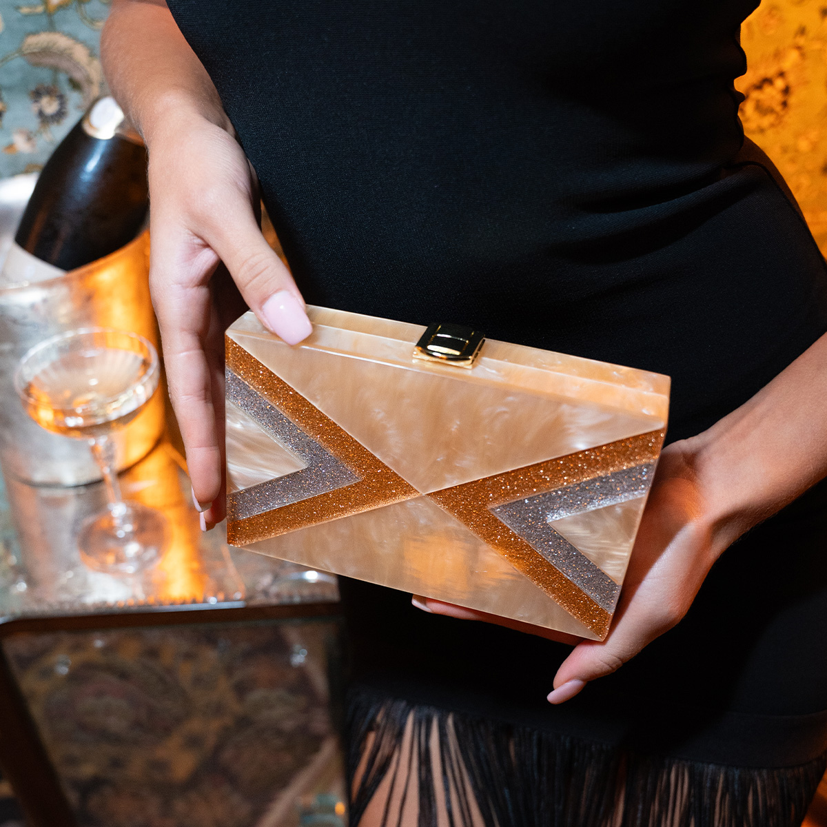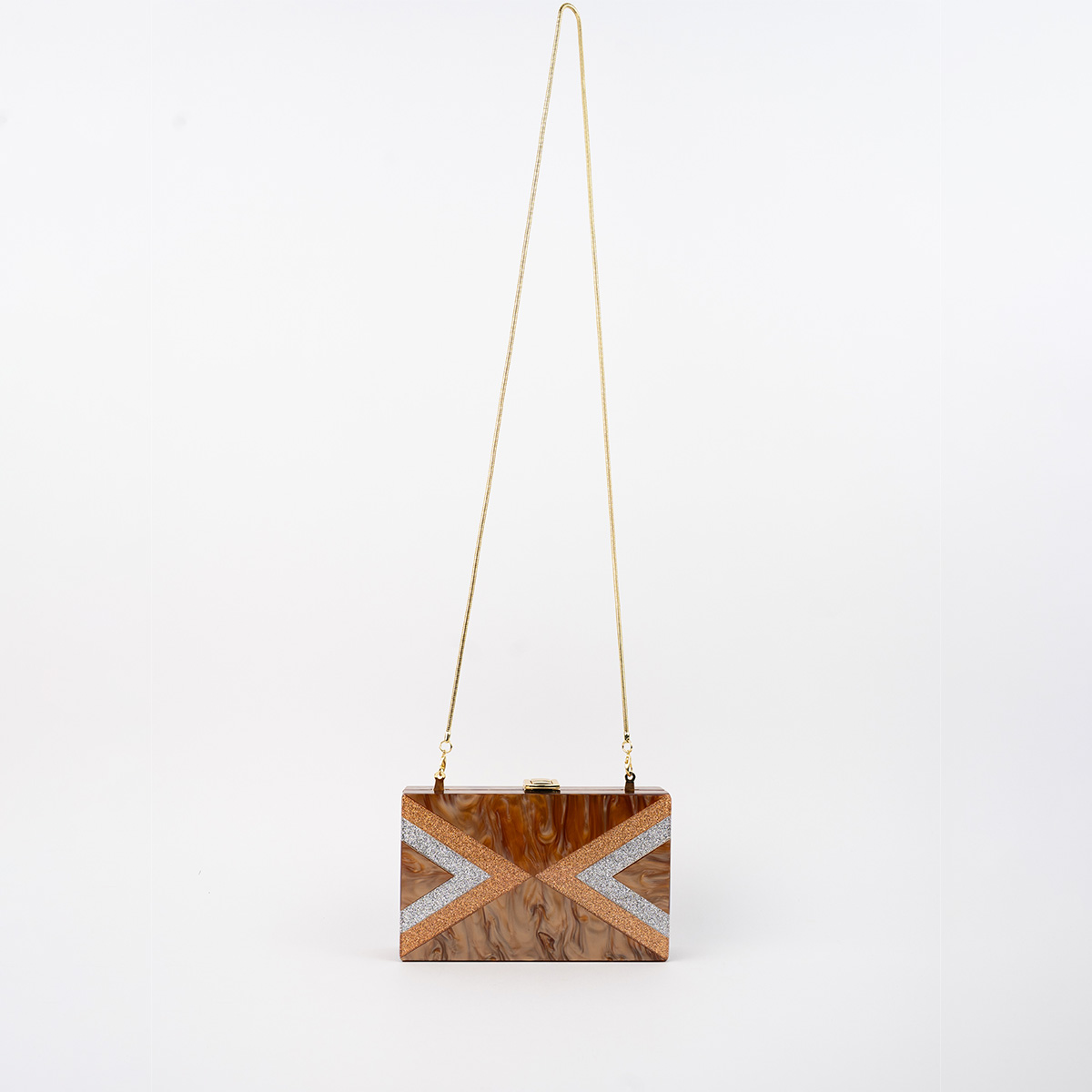 Le sac Crysta séduit par on design graphique audacieux et son aspect nacré.Son format rectangulaire structuré et entierement réalisé en acrylic effet marbré avec un motif géométrique en paillettes sur la face avant offrant un jeu de lumire élégant et festif.Il se ferme grace à un fermoir en métal doré situé sur le dessus.Le sac est entièrement doublé de polyester pour protéger vos effets personnels.Le modèle est accompagné d’une bandoulière amovible pour un porté croisé.Un accessoire chic et moderne idéal pour sublimer une tenue de soirée ou ajouter une touche de glamour à une silhouette plus minimaliste.