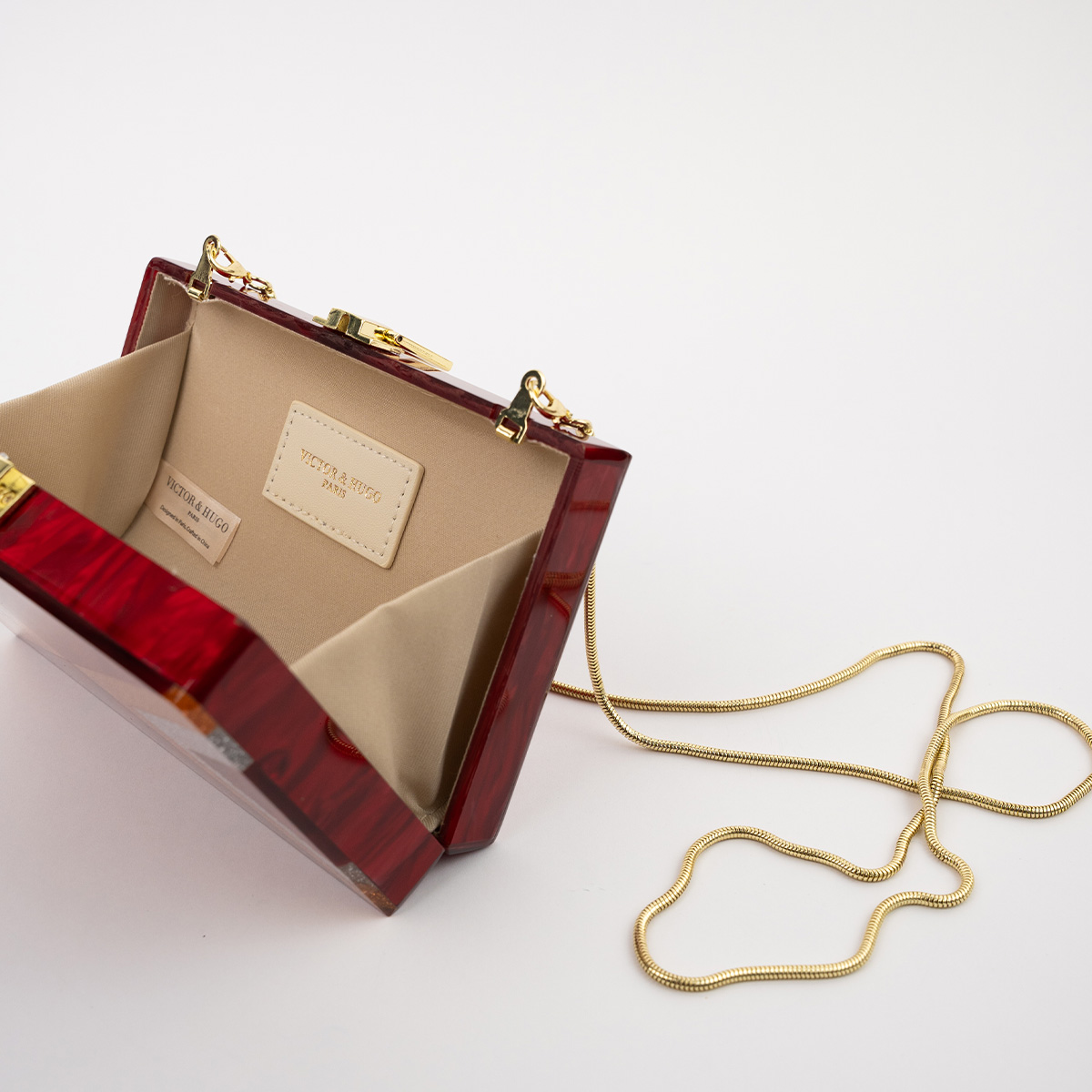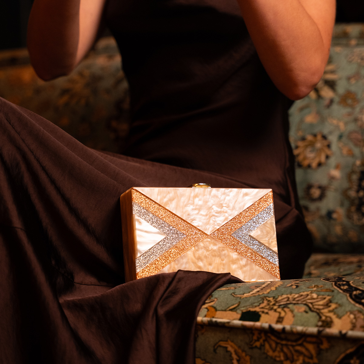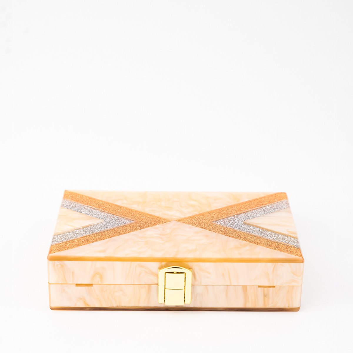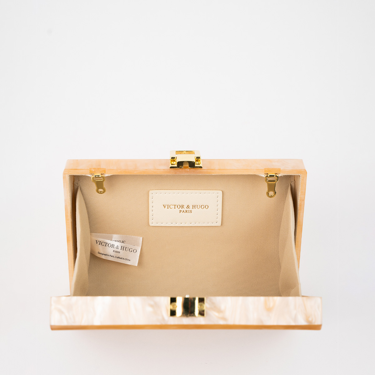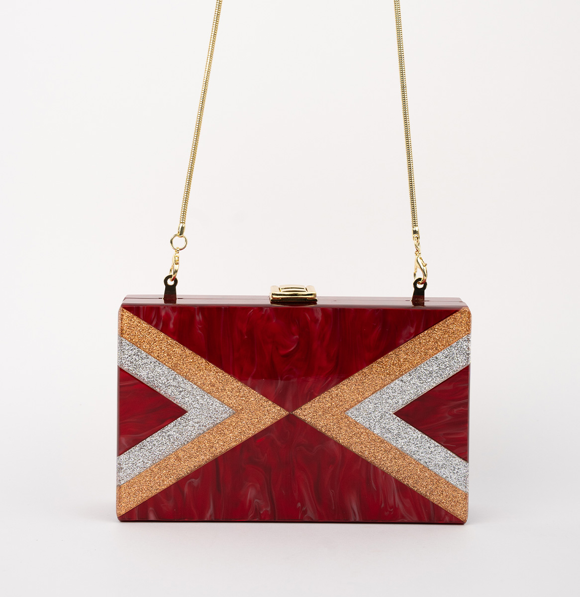 Le sac Crysta séduit par on design graphique audacieux et son aspect nacré.Son format rectangulaire structuré et entierement réalisé en acrylic effet marbré avec un motif géométrique en paillettes sur la face avant offrant un jeu de lumire élégant et festif.Il se ferme grace à un fermoir en métal doré situé sur le dessus.Le sac est entièrement doublé de polyester pour protéger vos effets personnels.Le modèle est accompagné d’une bandoulière amovible pour un porté croisé.Un accessoire chic et moderne idéal pour sublimer une tenue de soirée ou ajouter une touche de glamour à une silhouette plus minimaliste.