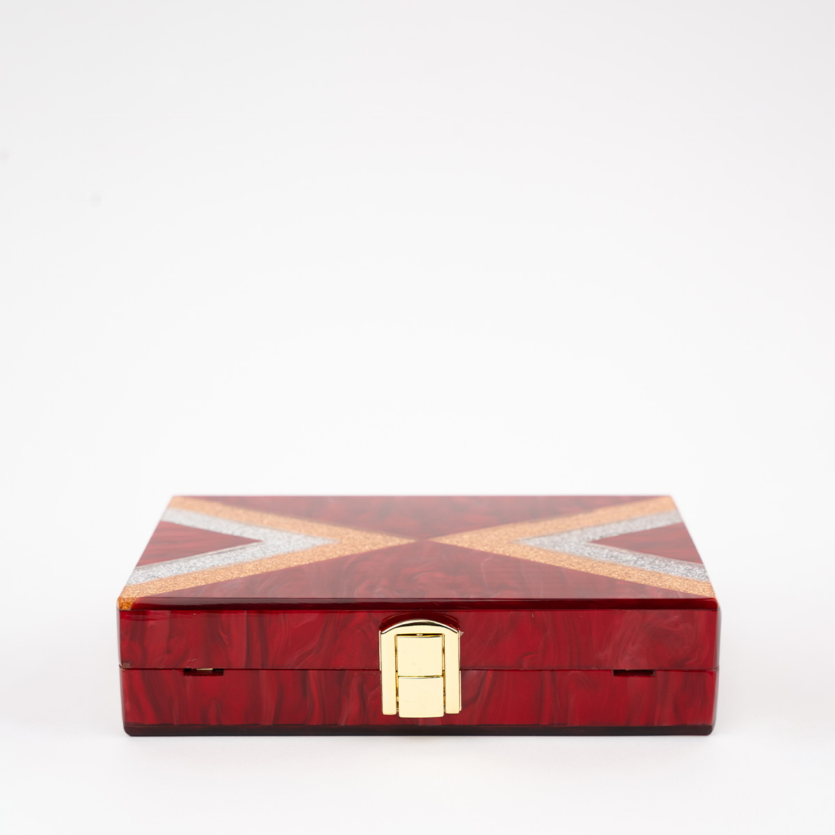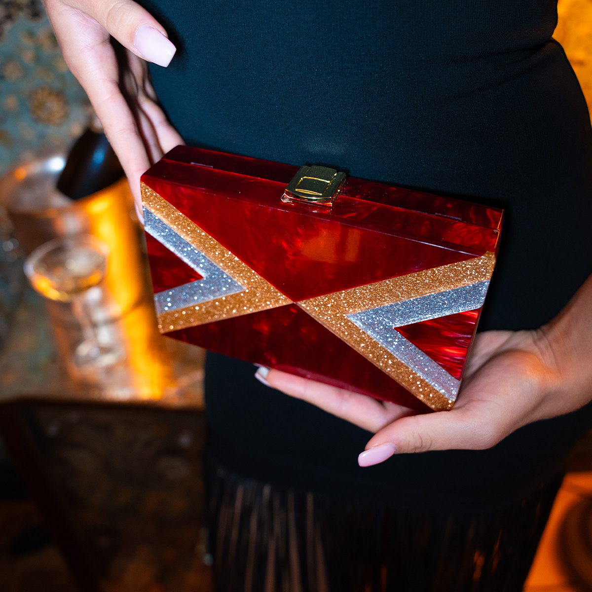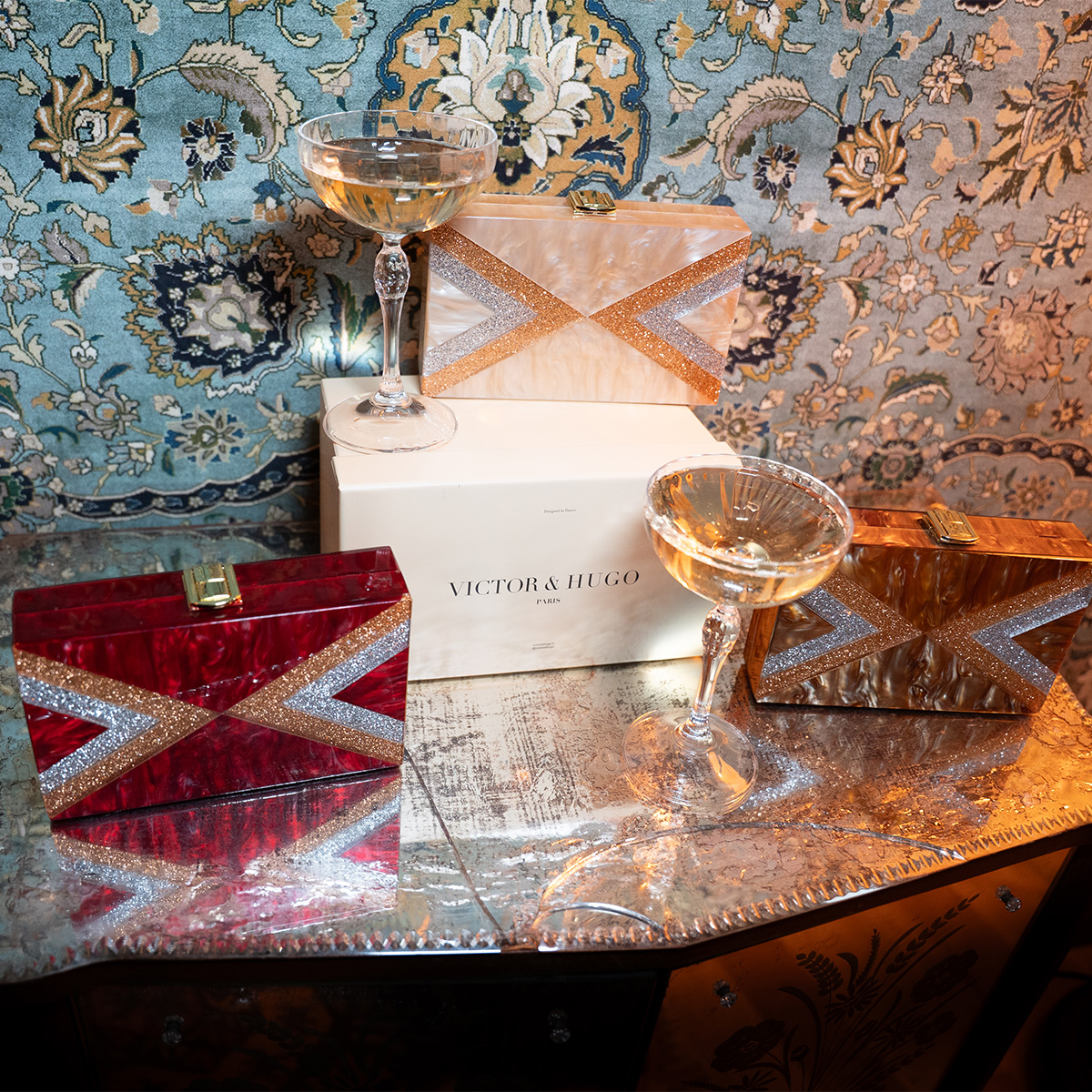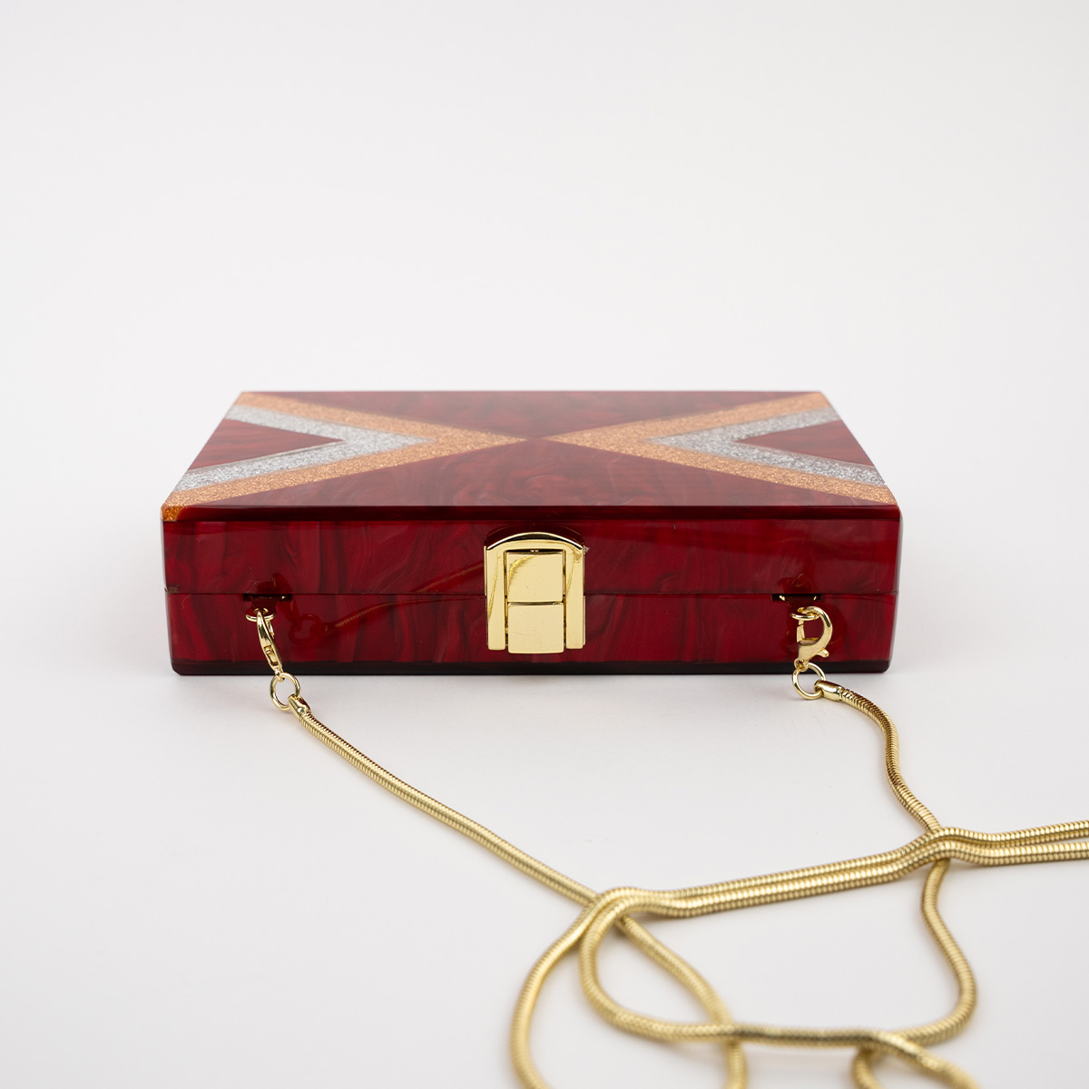 Le sac Crysta séduit par on design graphique audacieux et son aspect nacré.Son format rectangulaire structuré et entierement réalisé en acrylic effet marbré avec un motif géométrique en paillettes sur la face avant offrant un jeu de lumire élégant et festif.Il se ferme grace à un fermoir en métal doré situé sur le dessus.Le sac est entièrement doublé de polyester pour protéger vos effets personnels.Le modèle est accompagné d’une bandoulière amovible pour un porté croisé.Un accessoire chic et moderne idéal pour sublimer une tenue de soirée ou ajouter une touche de glamour à une silhouette plus minimaliste.