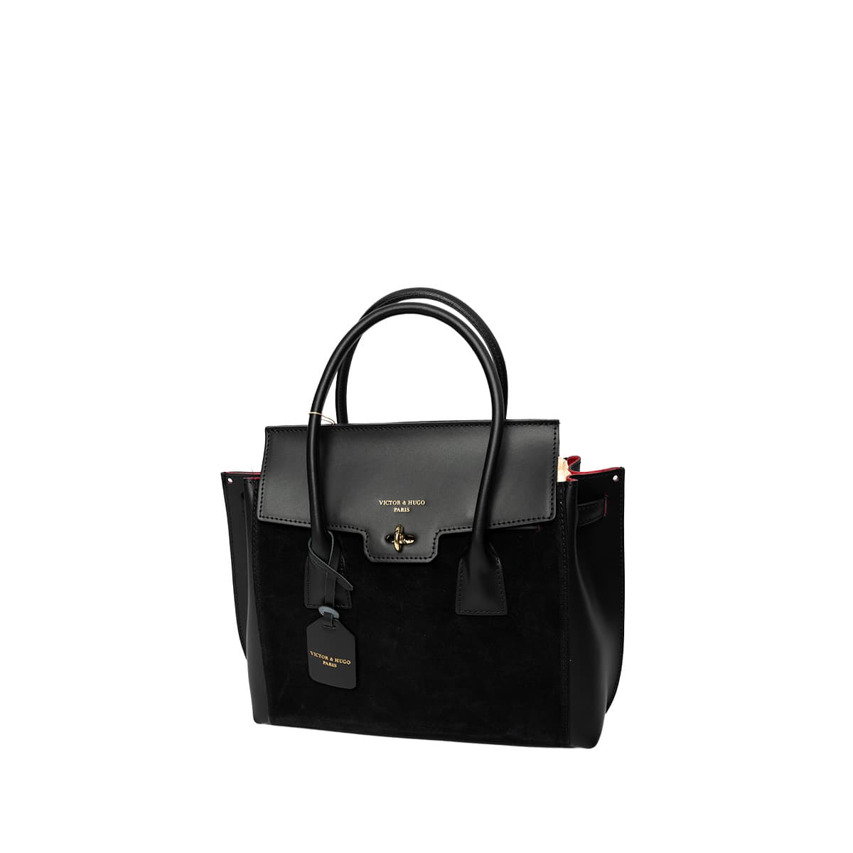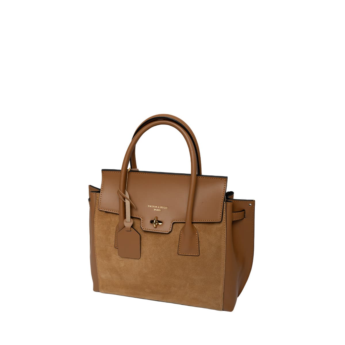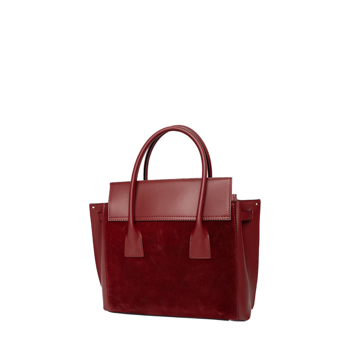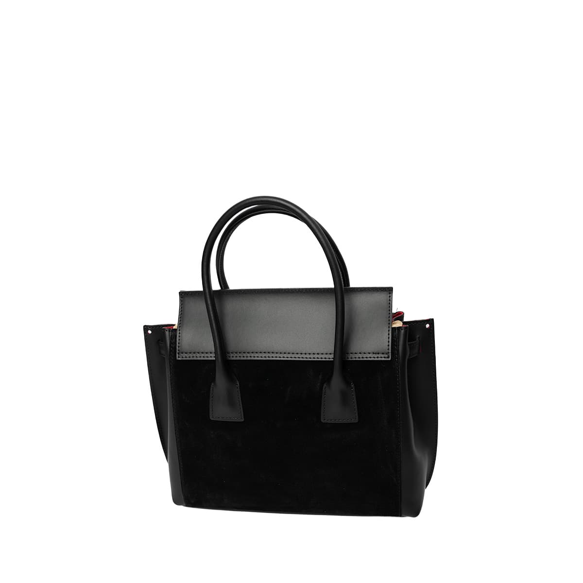 Sac à main style mallette muni de deux anses pour un porté main. Une anse bandoulière additionnelle permettant un porté épaule. Fermeture à rabat par deux lanières cuir à bouton pression invisible + un loquet rotatif. Picots de protection métalliques sous le sac. Intérieur : compartiments de rangements et emplacement téléphone mobile.