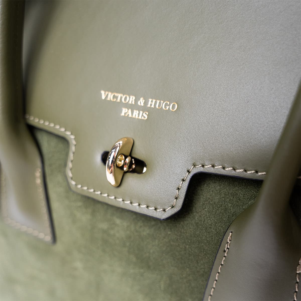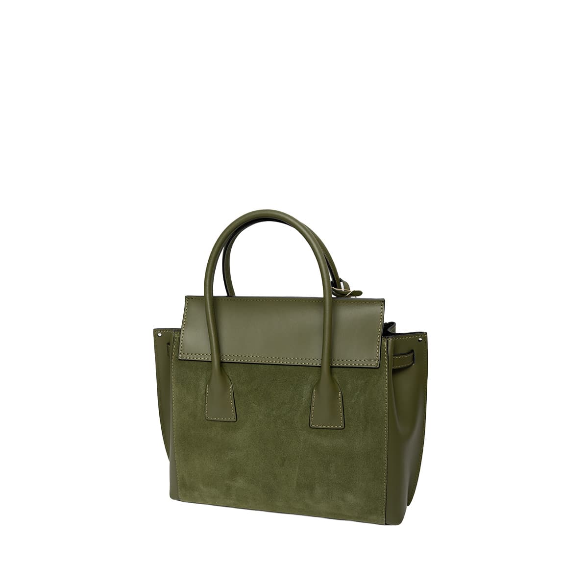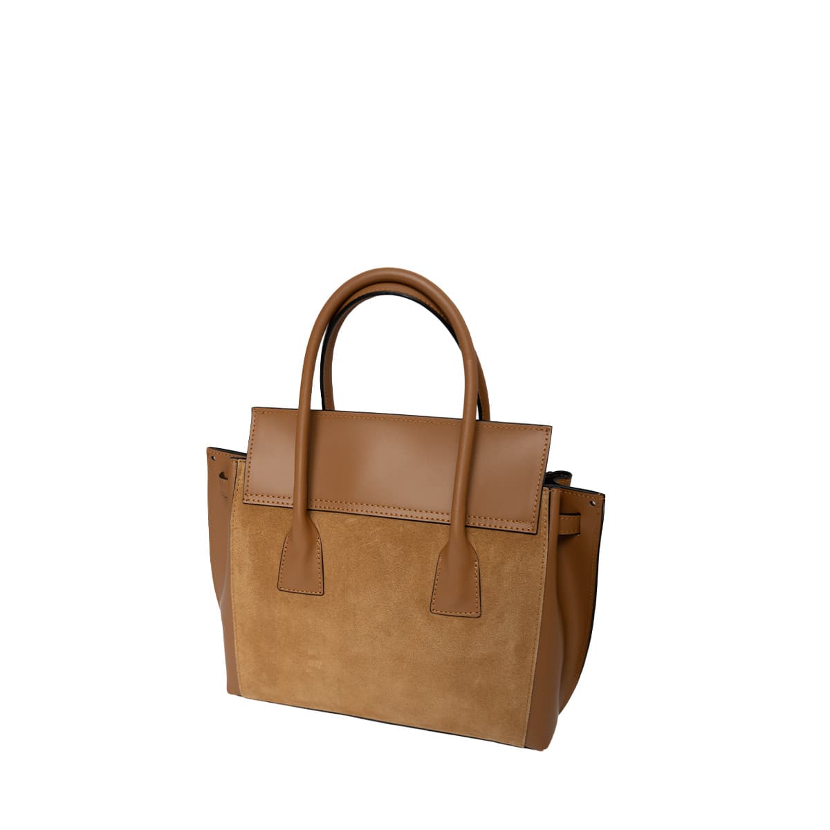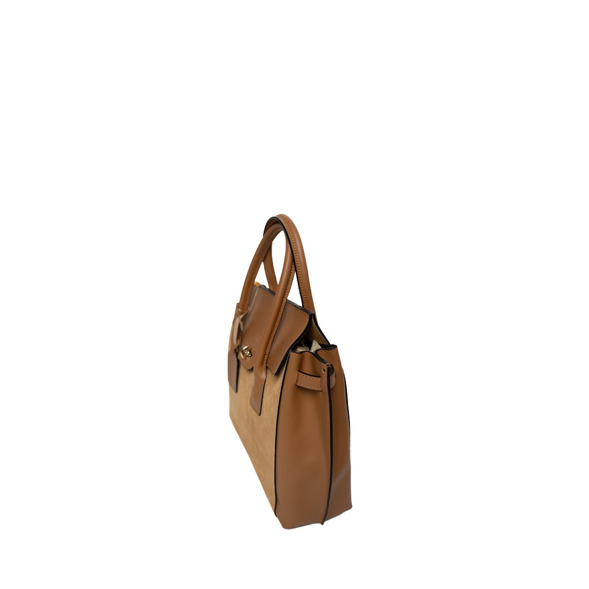 Sac à main style mallette muni de deux anses pour un porté main. Une anse bandoulière additionnelle permettant un porté épaule. Fermeture à rabat par deux lanières cuir à bouton pression invisible + un loquet rotatif. Picots de protection métalliques sous le sac. Intérieur : compartiments de rangements et emplacement téléphone mobile.