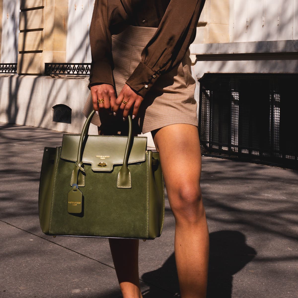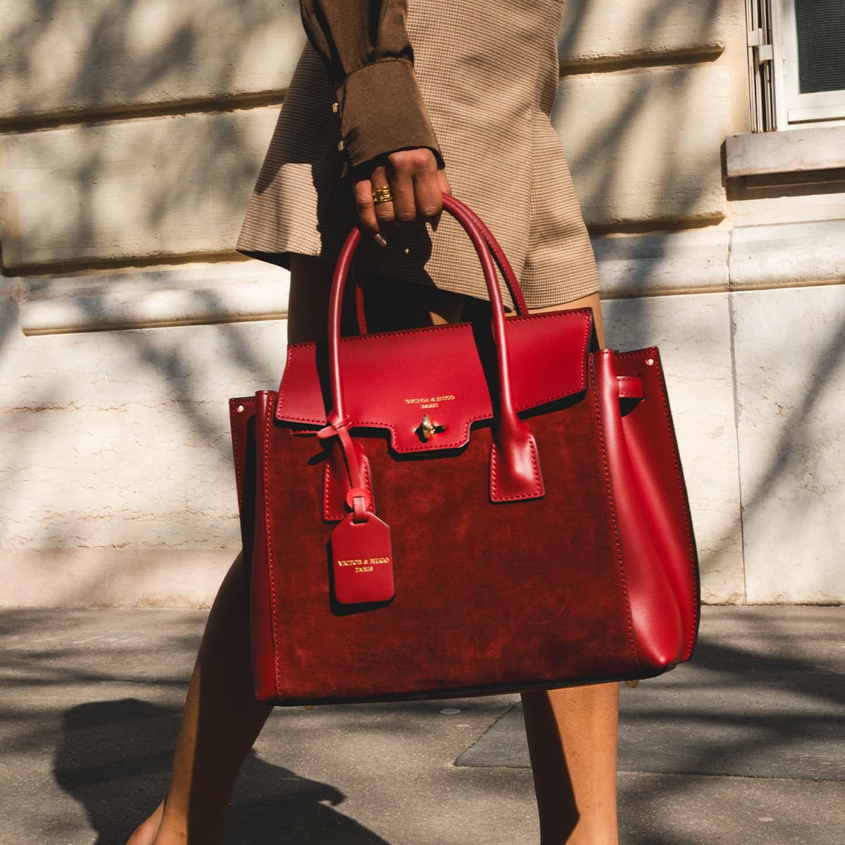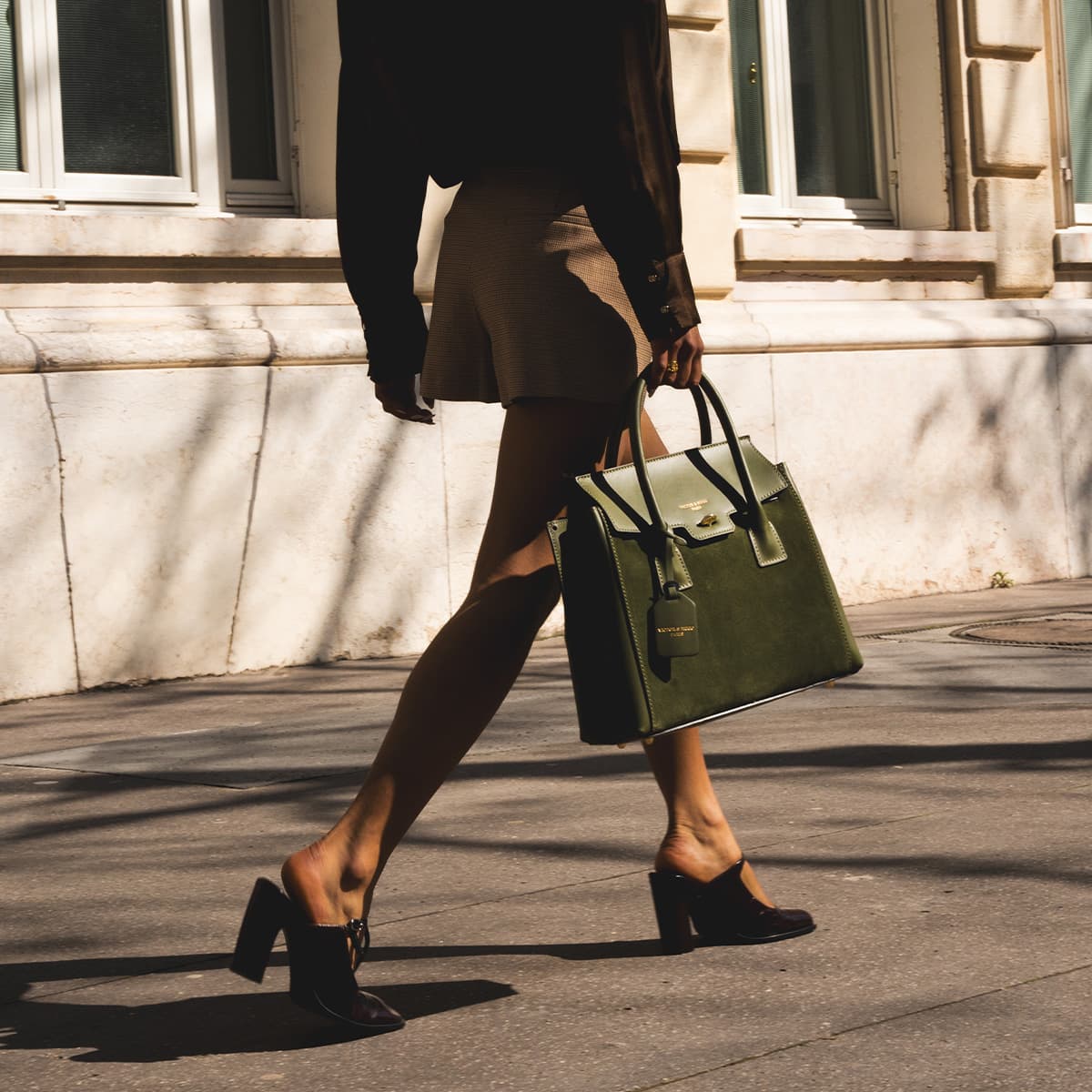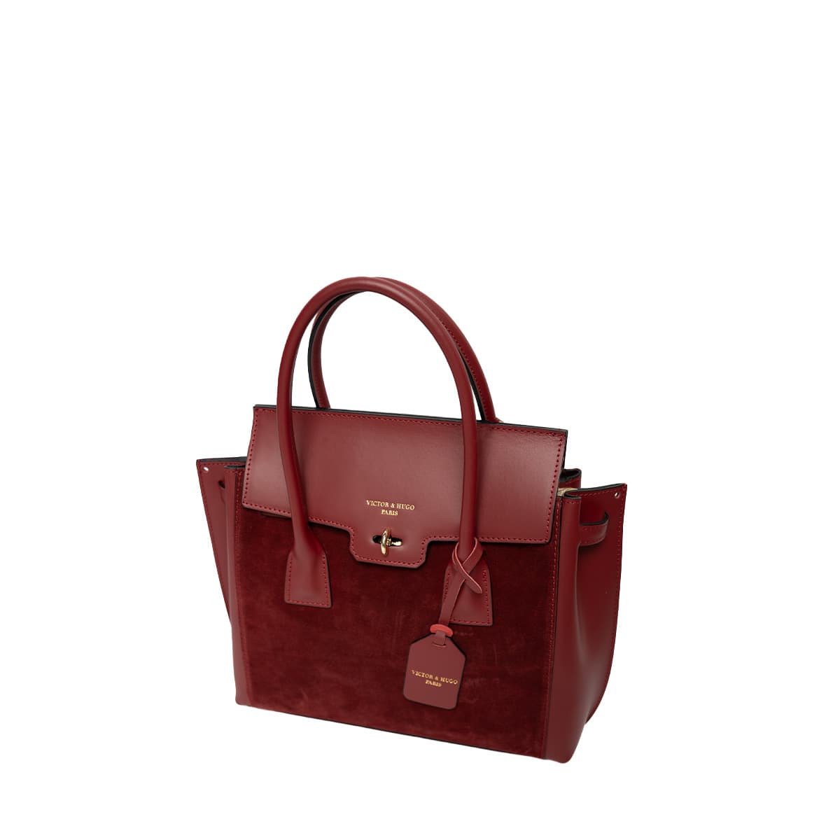 Sac à main style mallette muni de deux anses pour un porté main. Une anse bandoulière additionnelle permettant un porté épaule. Fermeture à rabat par deux lanières cuir à bouton pression invisible + un loquet rotatif. Picots de protection métalliques sous le sac. Intérieur : compartiments de rangements et emplacement téléphone mobile.