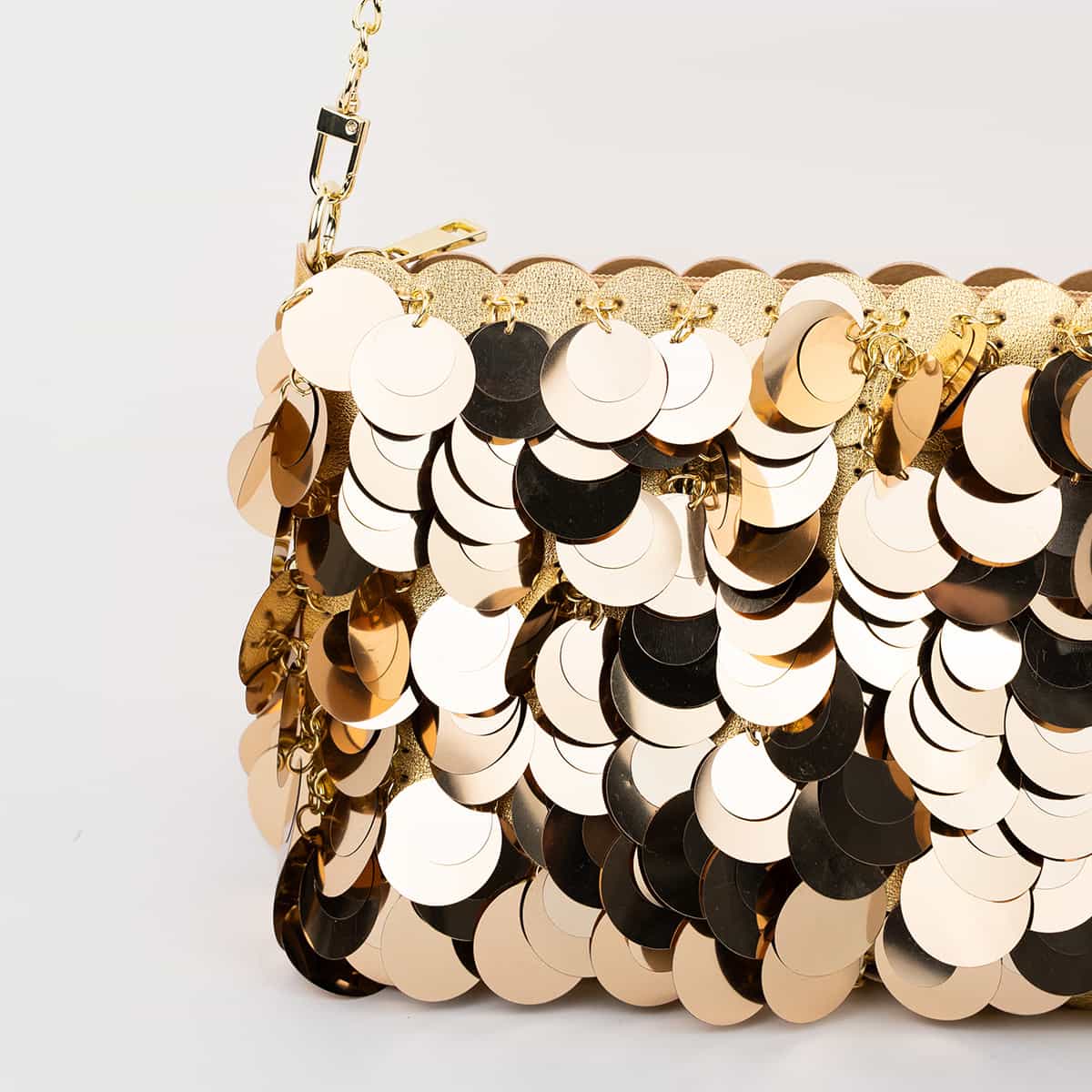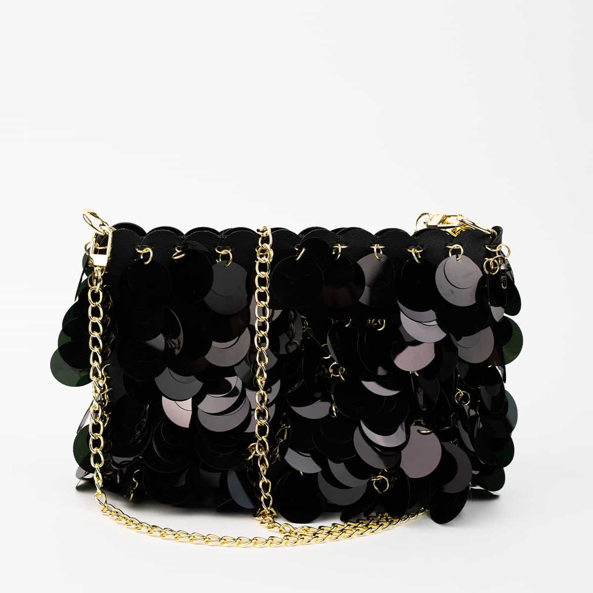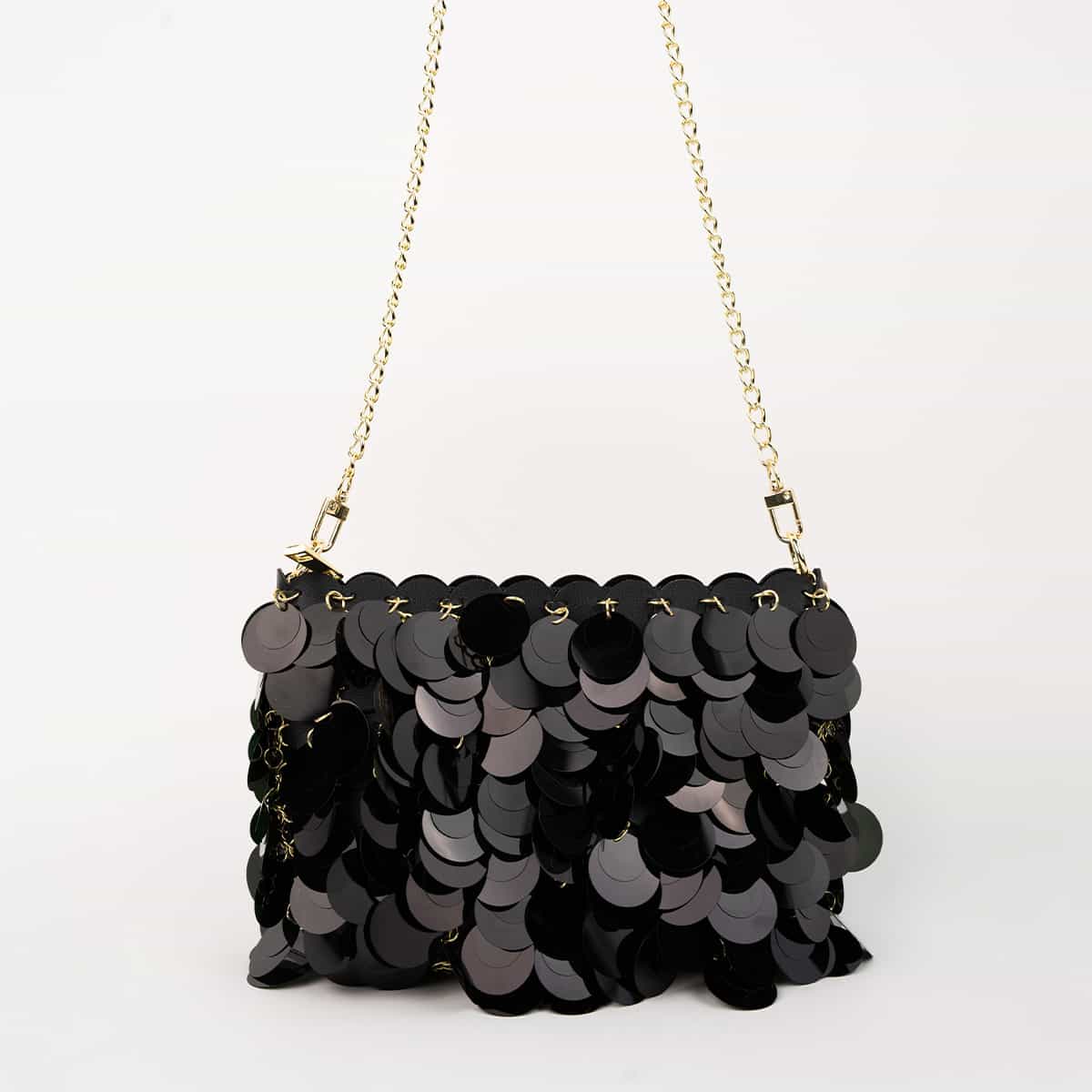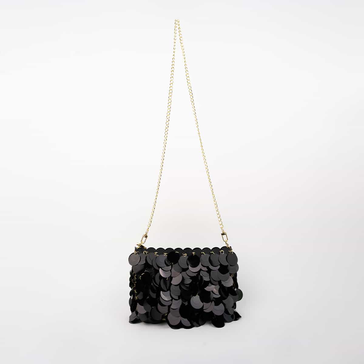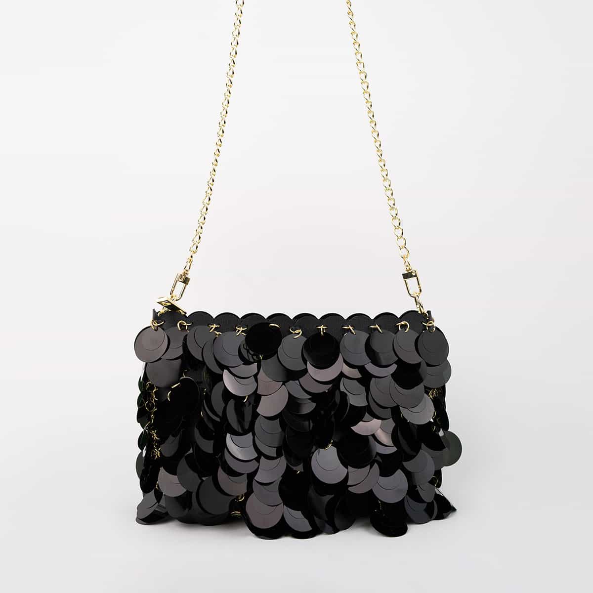Le sac Joya en acrylic se distingue par son esprit festif et son design spectaculaire .Son format mini rectangulaire est entièrement orné de disques métallisés dorés façon sequins oversize,qui créent un mouvement scintillant à chaque geste.Il se ferme par une fermeture zippée dorée sur le dessus et s’accompagne d’une chaine fine amovible pour un porté epaule ou croisé.A l’interieur le sac est entierement doublé en polyester et comprend un compartiment principal pour vos essentiels de soirée.
