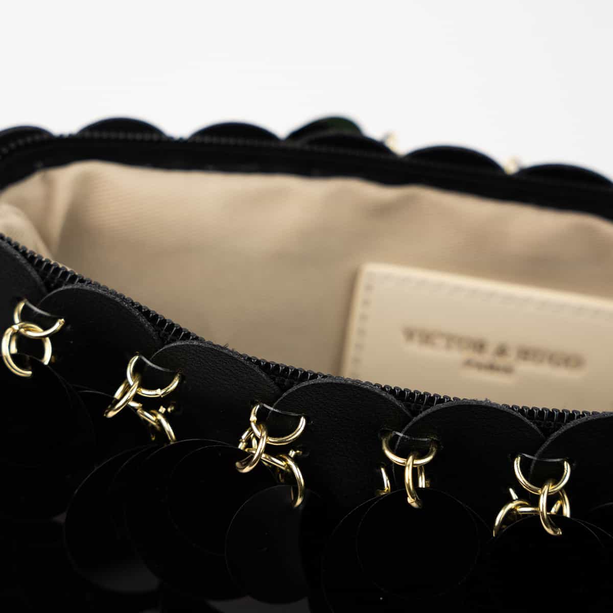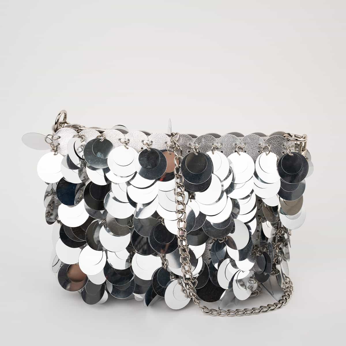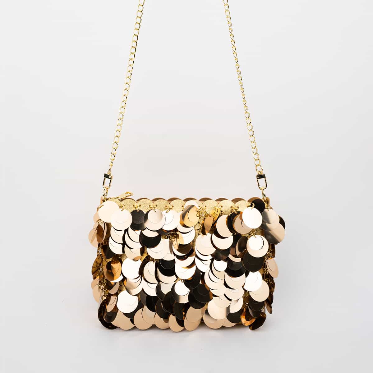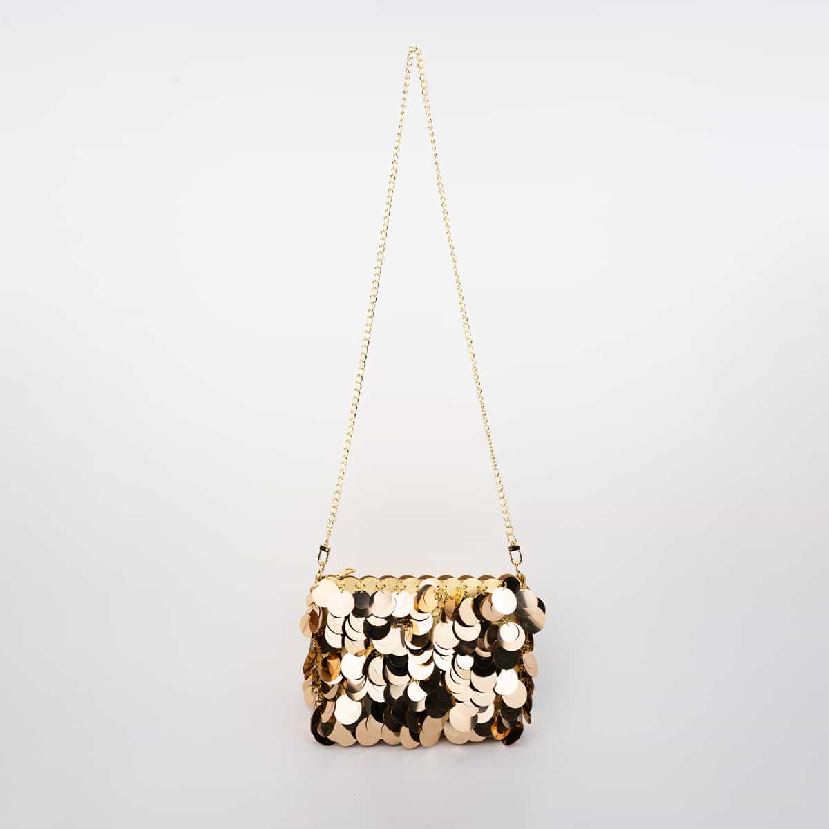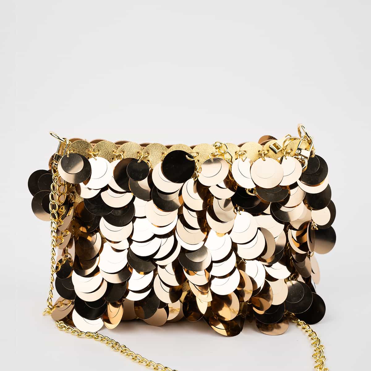 Le sac Joya en acrylic se distingue par son esprit festif et son design spectaculaire .Son format mini rectangulaire est entièrement orné de disques métallisés dorés façon sequins oversize,qui créent un mouvement scintillant à chaque geste.Il se ferme par une fermeture zippée dorée sur le dessus et s’accompagne d’une chaine fine amovible pour un porté epaule ou croisé.A l’interieur le sac est entierement doublé en polyester et comprend un compartiment principal pour vos essentiels de soirée.