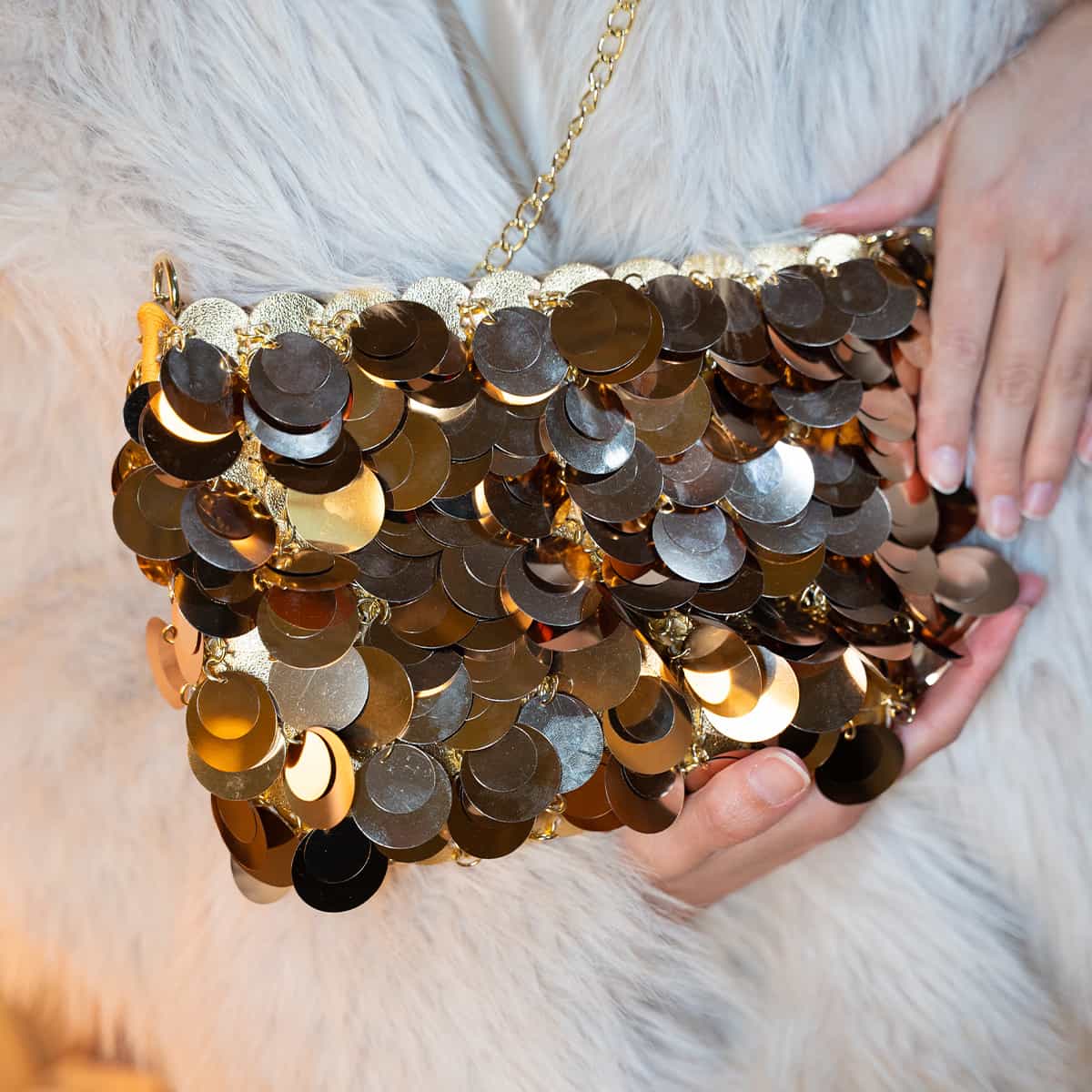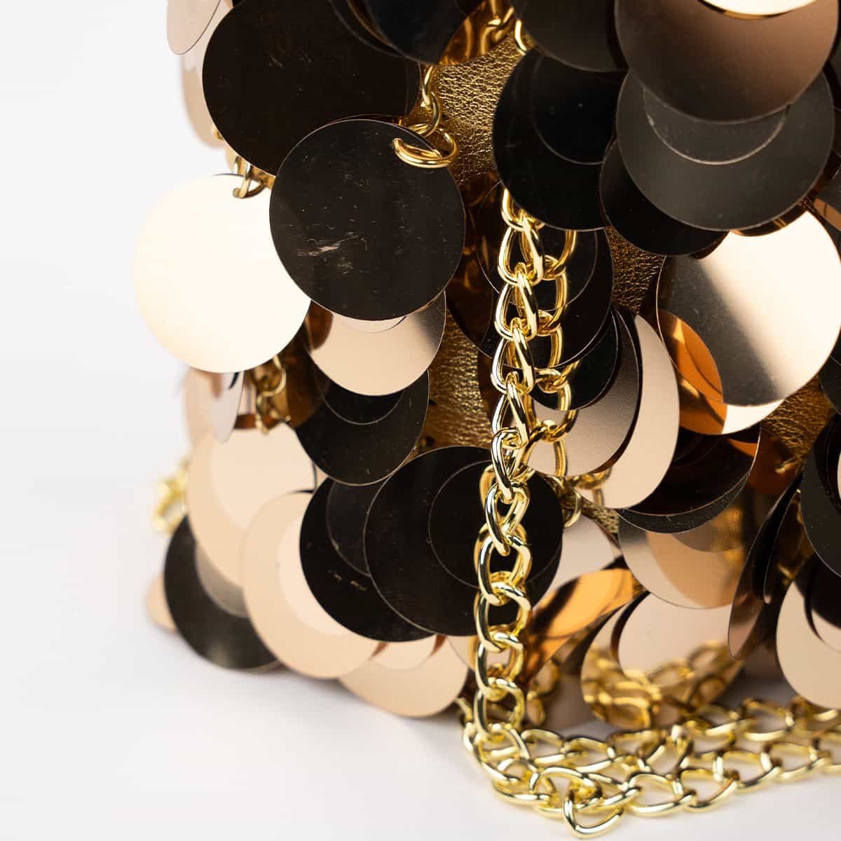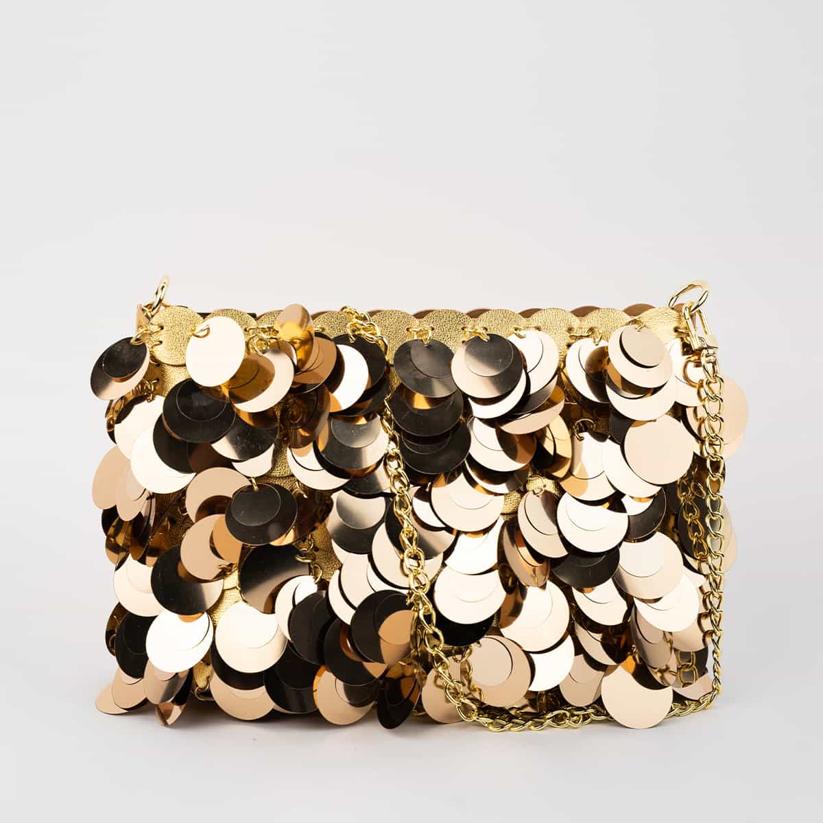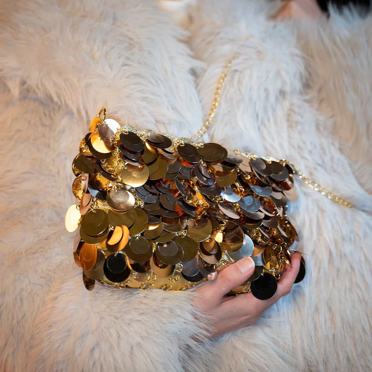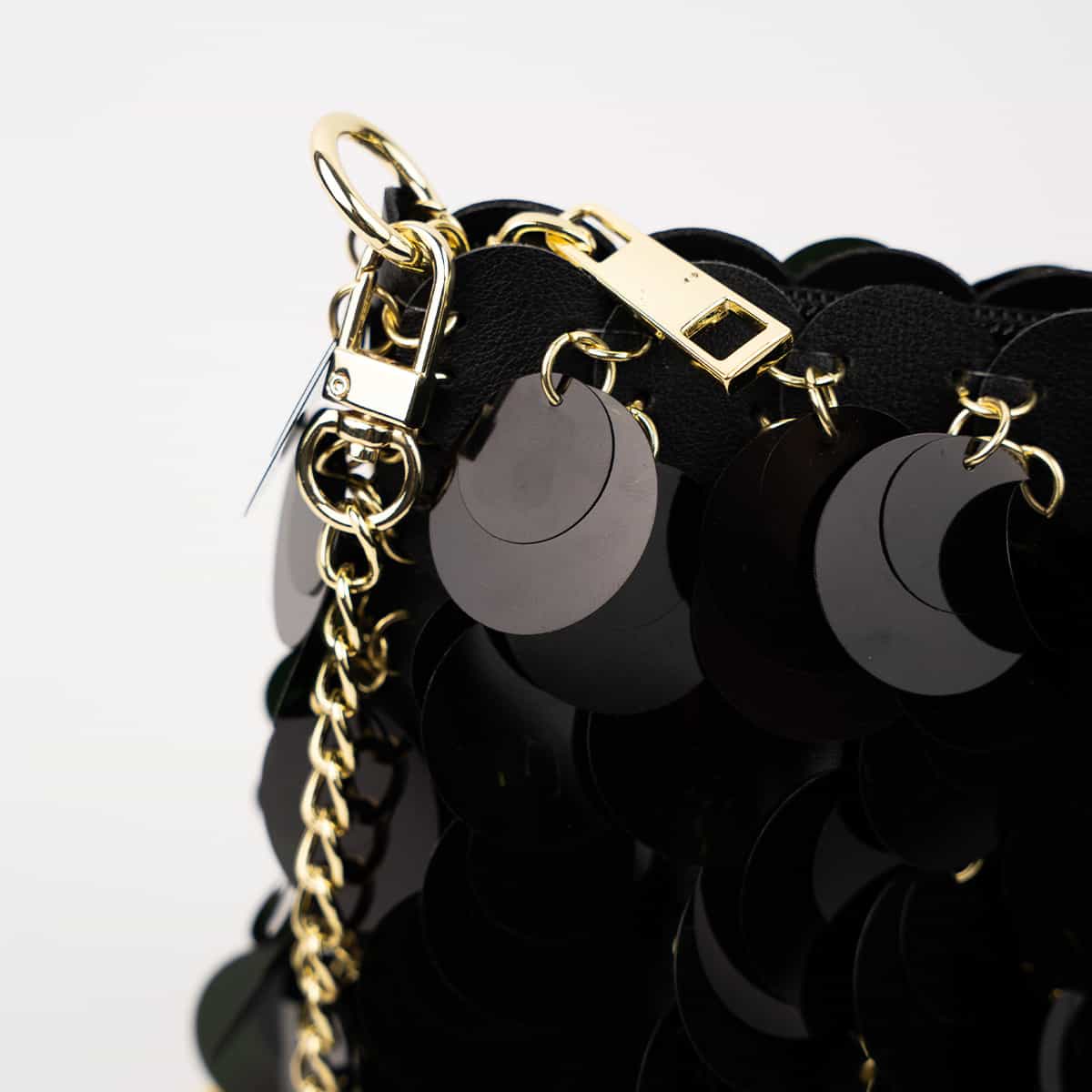 Le sac Joya en acrylic se distingue par son esprit festif et son design spectaculaire .Son format mini rectangulaire est entièrement orné de disques métallisés dorés façon sequins oversize,qui créent un mouvement scintillant à chaque geste.Il se ferme par une fermeture zippée dorée sur le dessus et s’accompagne d’une chaine fine amovible pour un porté epaule ou croisé.A l’interieur le sac est entierement doublé en polyester et comprend un compartiment principal pour vos essentiels de soirée.