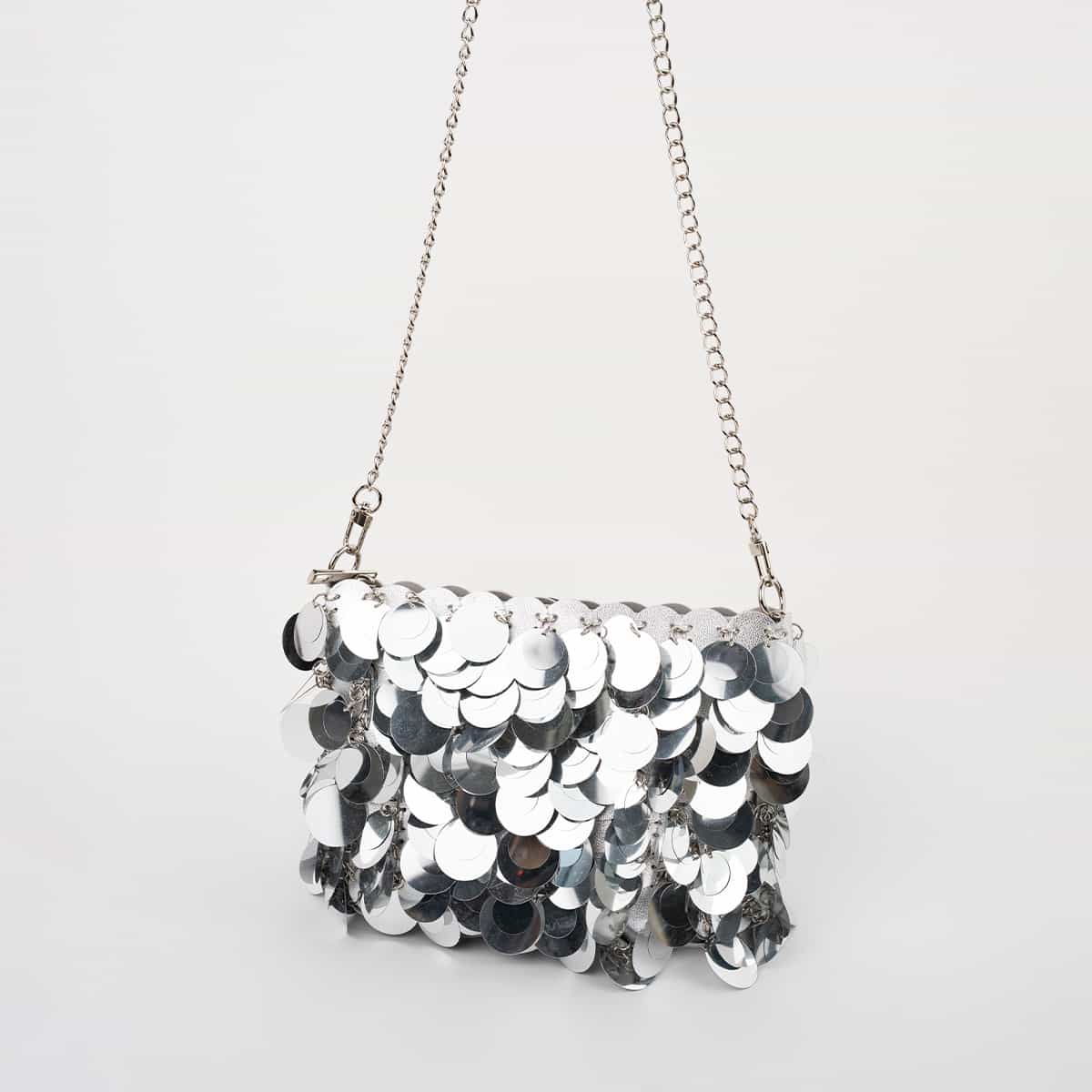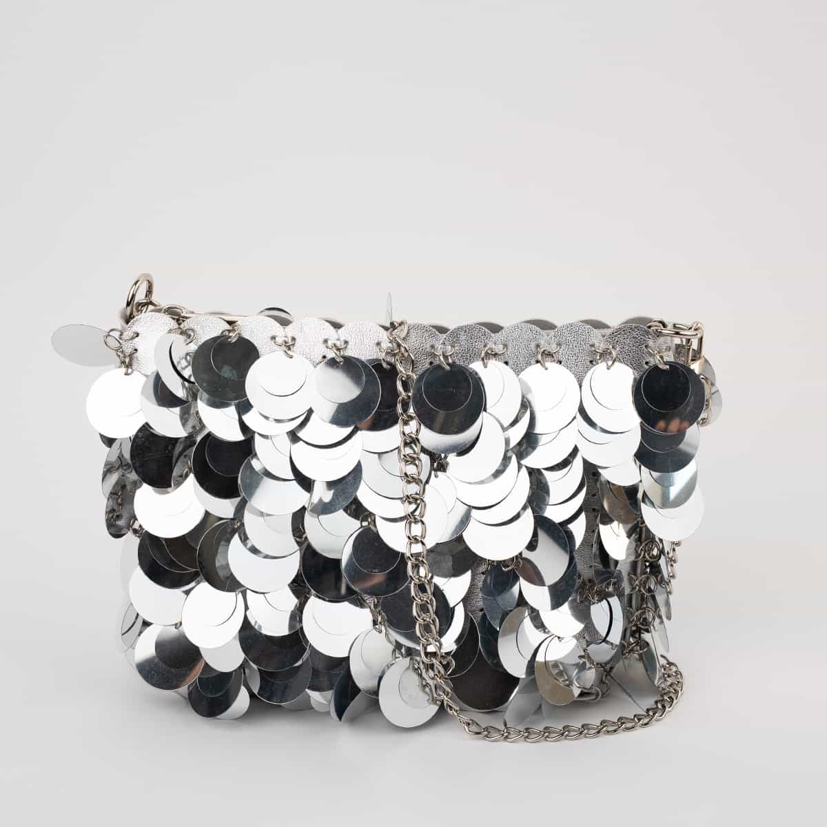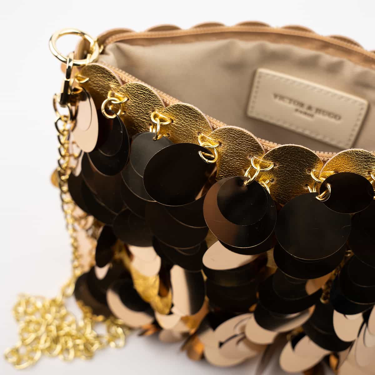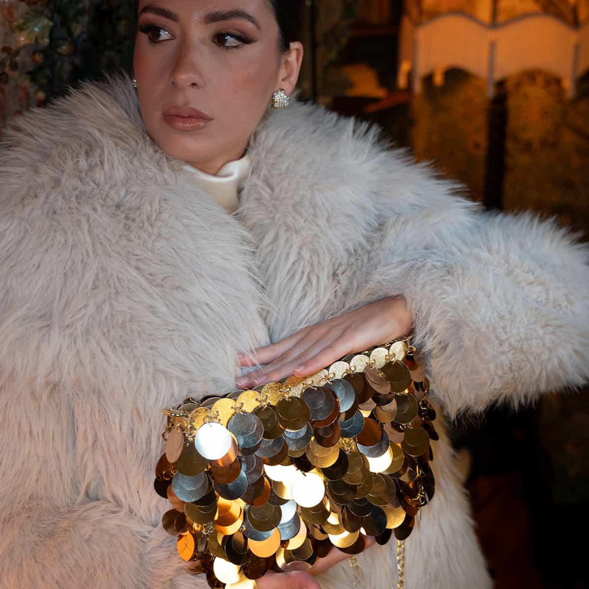 Le sac Joya en acrylic se distingue par son esprit festif et son design spectaculaire .Son format mini rectangulaire est entièrement orné de disques métallisés dorés façon sequins oversize,qui créent un mouvement scintillant à chaque geste.Il se ferme par une fermeture zippée dorée sur le dessus et s’accompagne d’une chaine fine amovible pour un porté epaule ou croisé.A l’interieur le sac est entierement doublé en polyester et comprend un compartiment principal pour vos essentiels de soirée.
