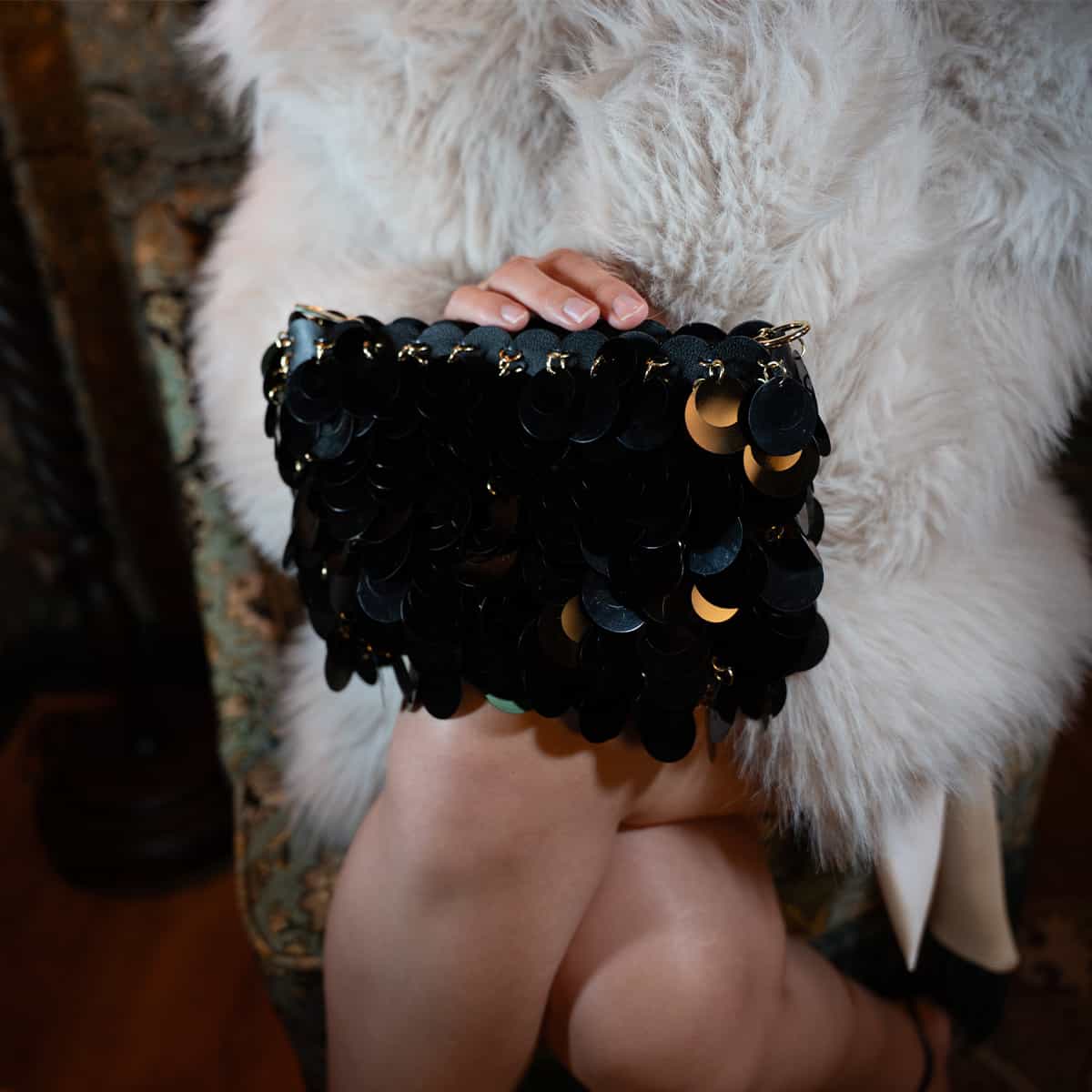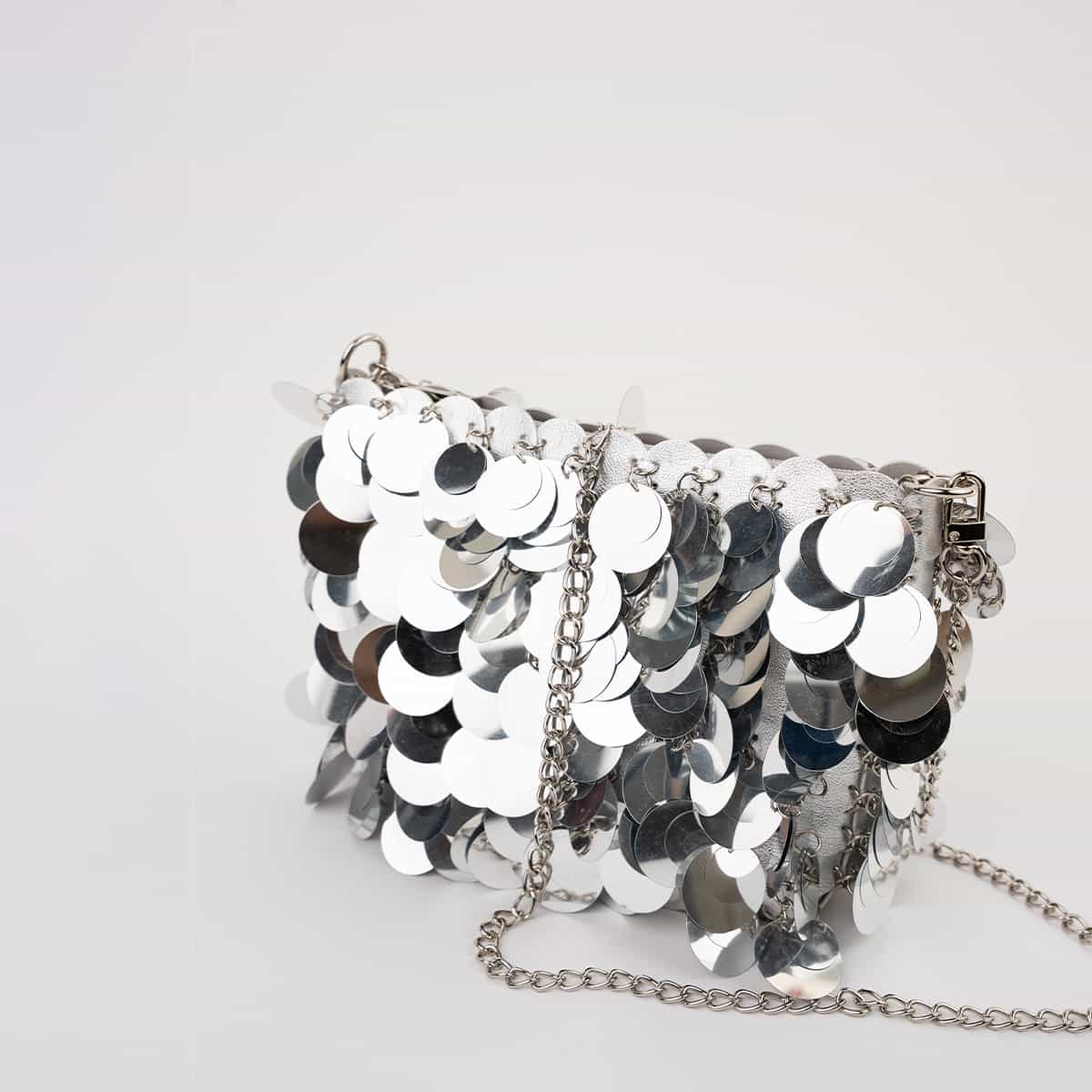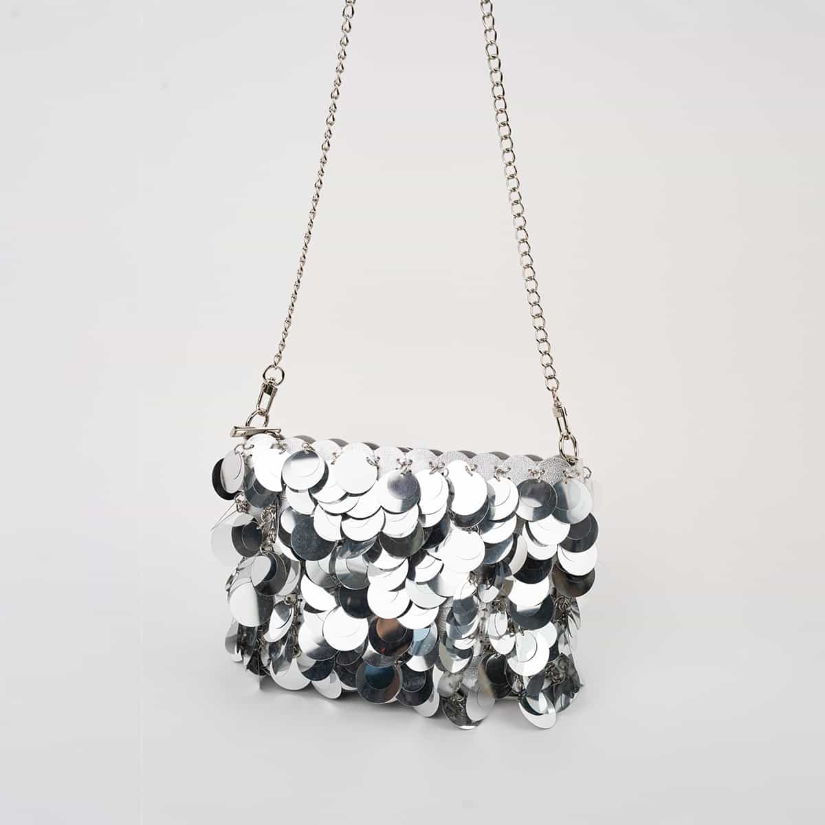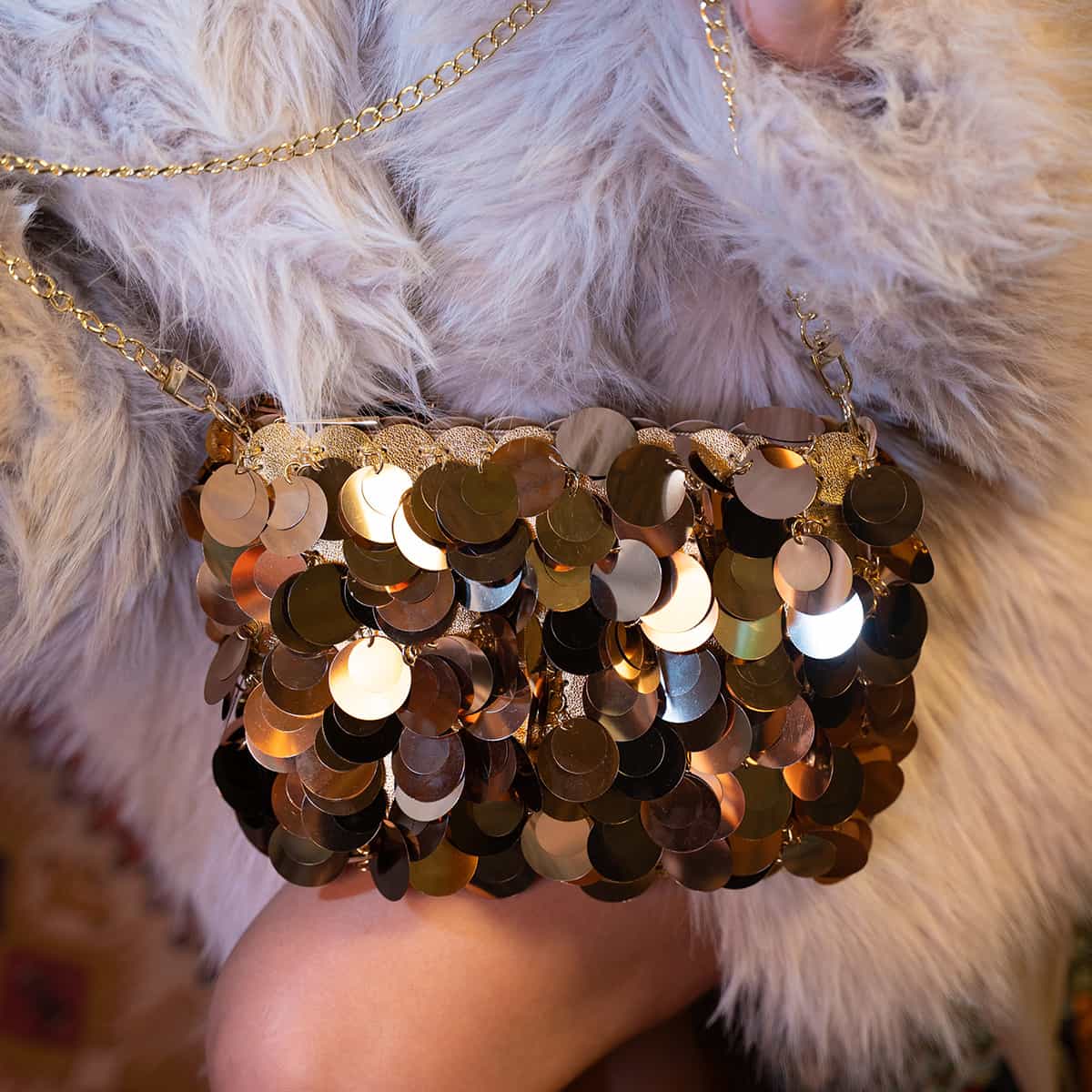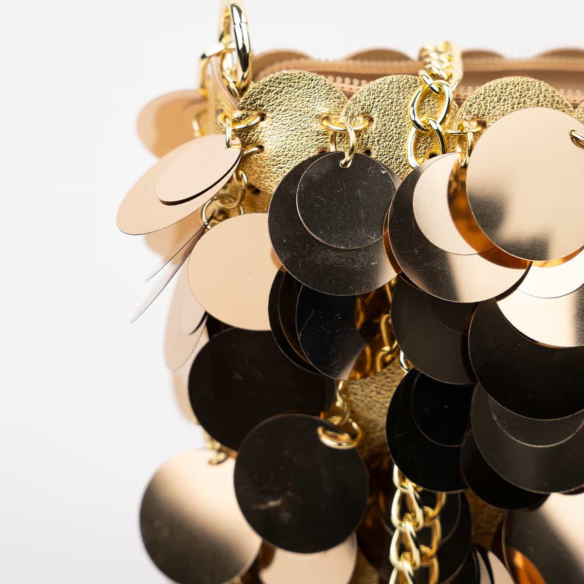 Le sac Joya en acrylic se distingue par son esprit festif et son design spectaculaire .Son format mini rectangulaire est entièrement orné de disques métallisés dorés façon sequins oversize,qui créent un mouvement scintillant à chaque geste.Il se ferme par une fermeture zippée dorée sur le dessus et s’accompagne d’une chaine fine amovible pour un porté epaule ou croisé.A l’interieur le sac est entierement doublé en polyester et comprend un compartiment principal pour vos essentiels de soirée.