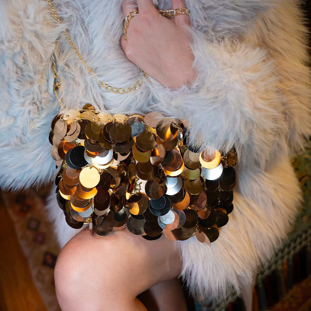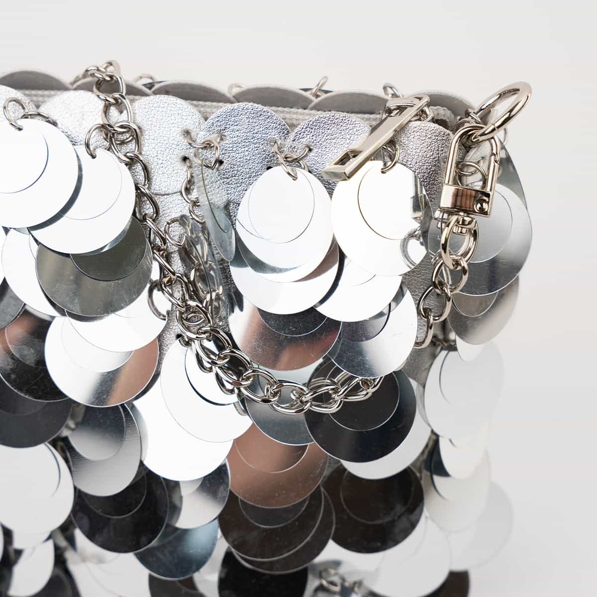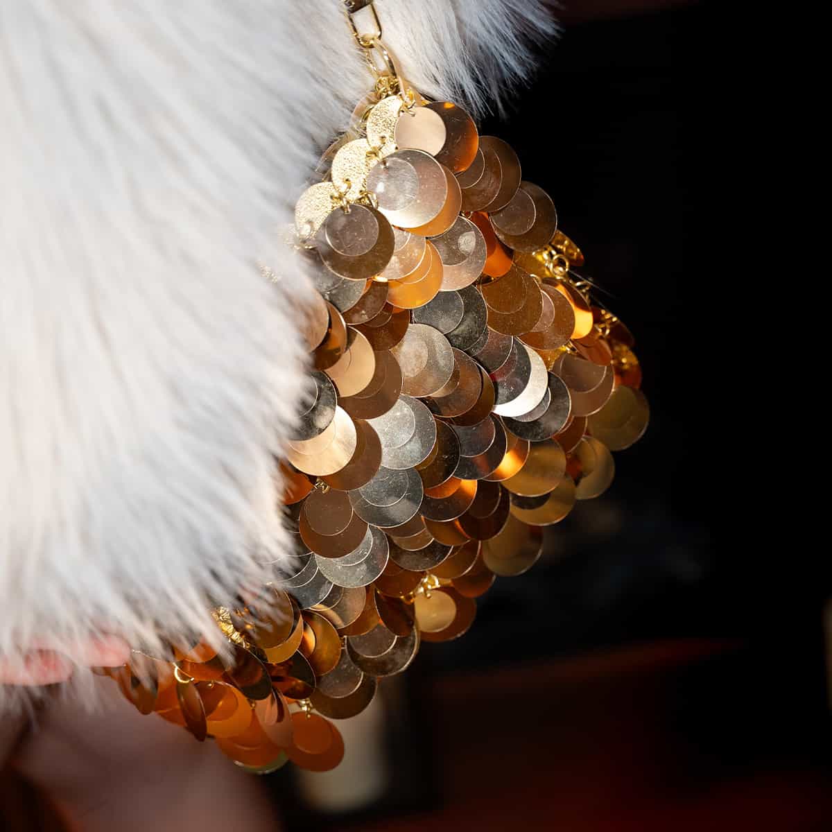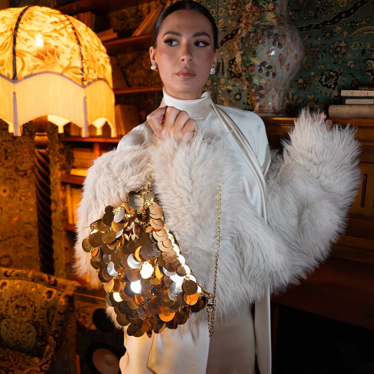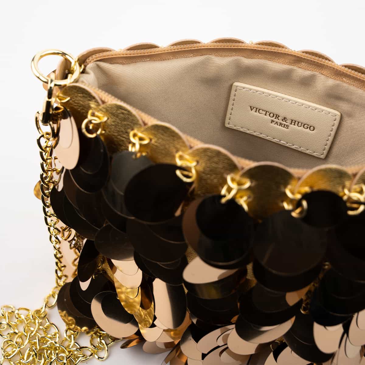 Le sac Joya en acrylic se distingue par son esprit festif et son design spectaculaire .Son format mini rectangulaire est entièrement orné de disques métallisés dorés façon sequins oversize,qui créent un mouvement scintillant à chaque geste.Il se ferme par une fermeture zippée dorée sur le dessus et s’accompagne d’une chaine fine amovible pour un porté epaule ou croisé.A l’interieur le sac est entierement doublé en polyester et comprend un compartiment principal pour vos essentiels de soirée.