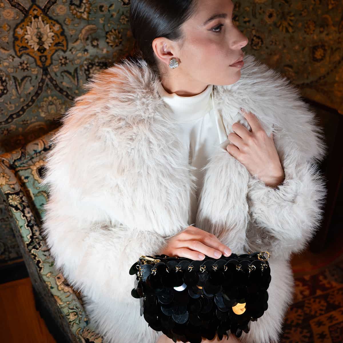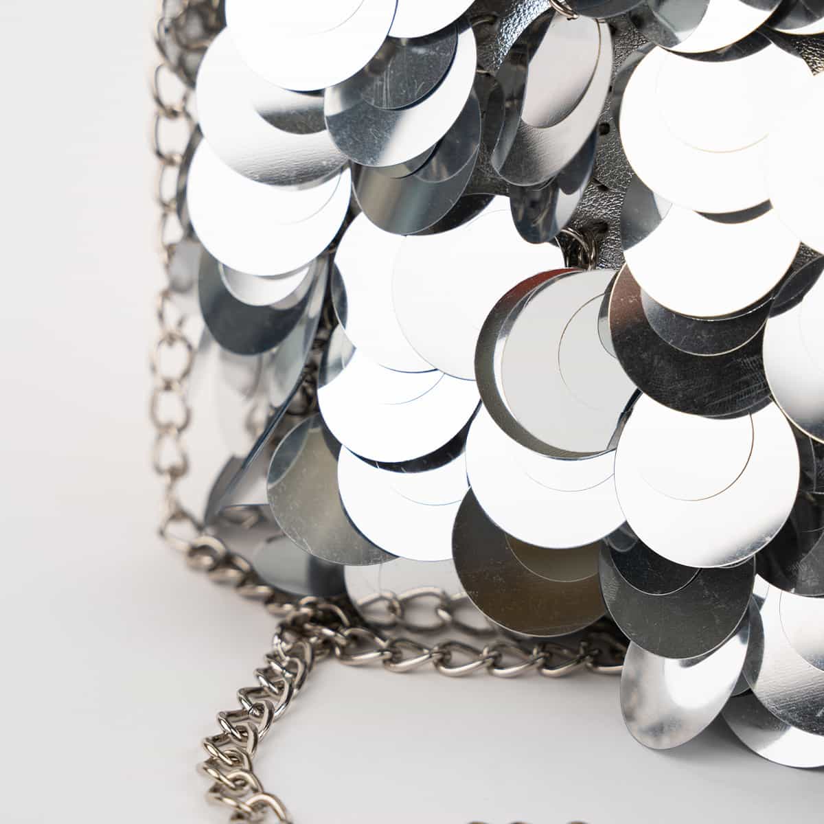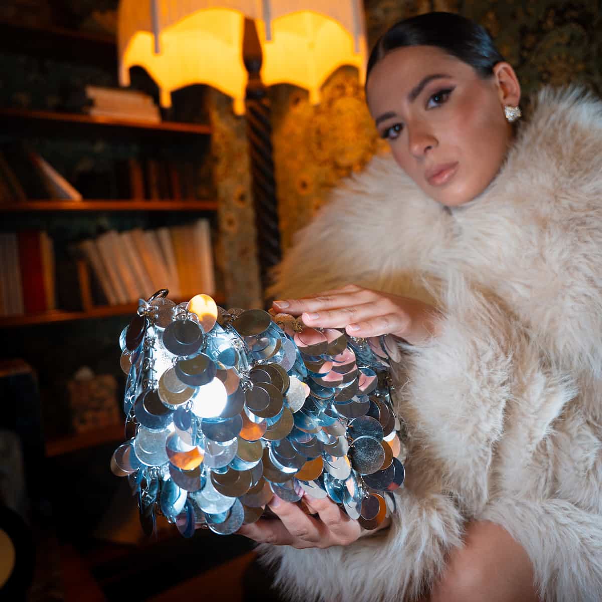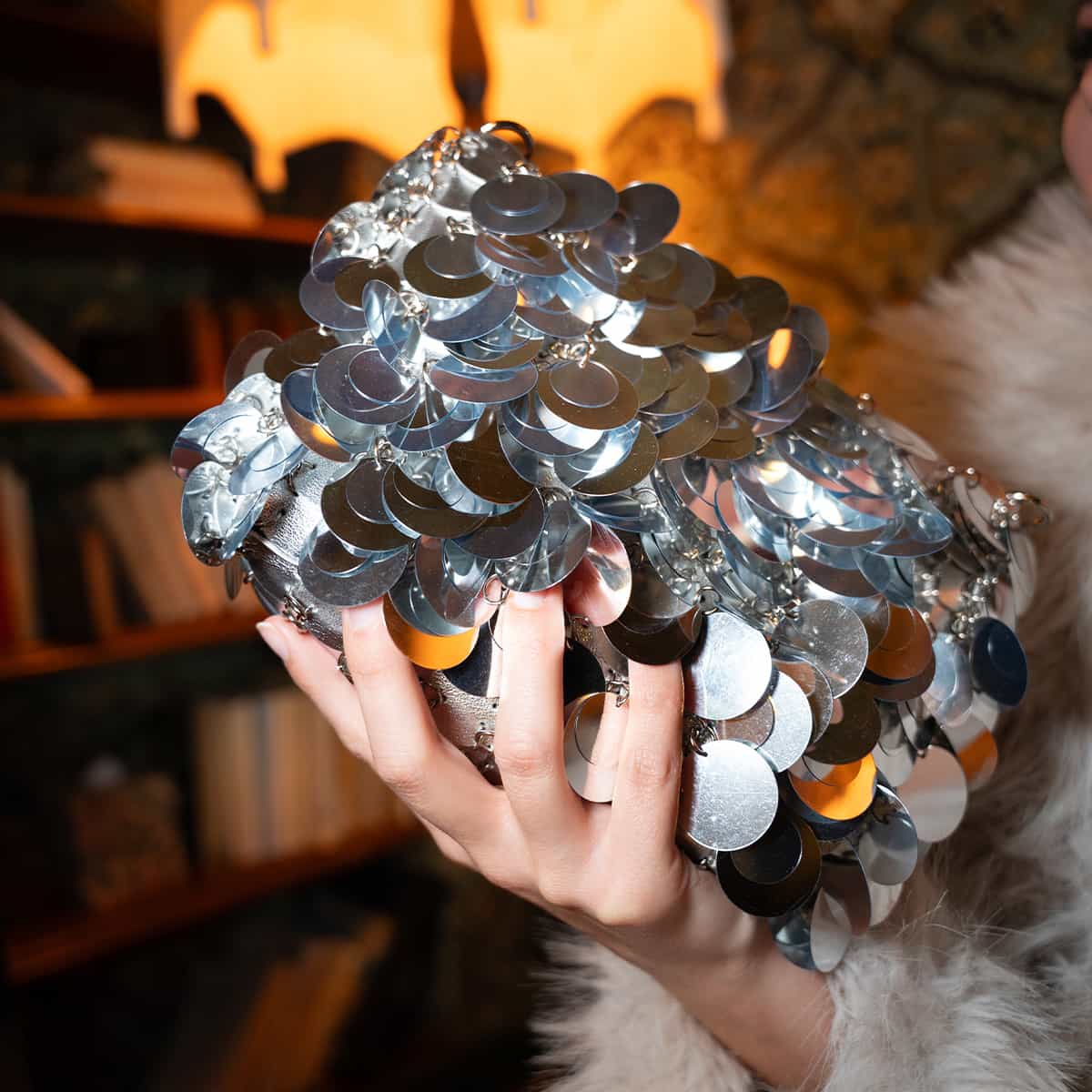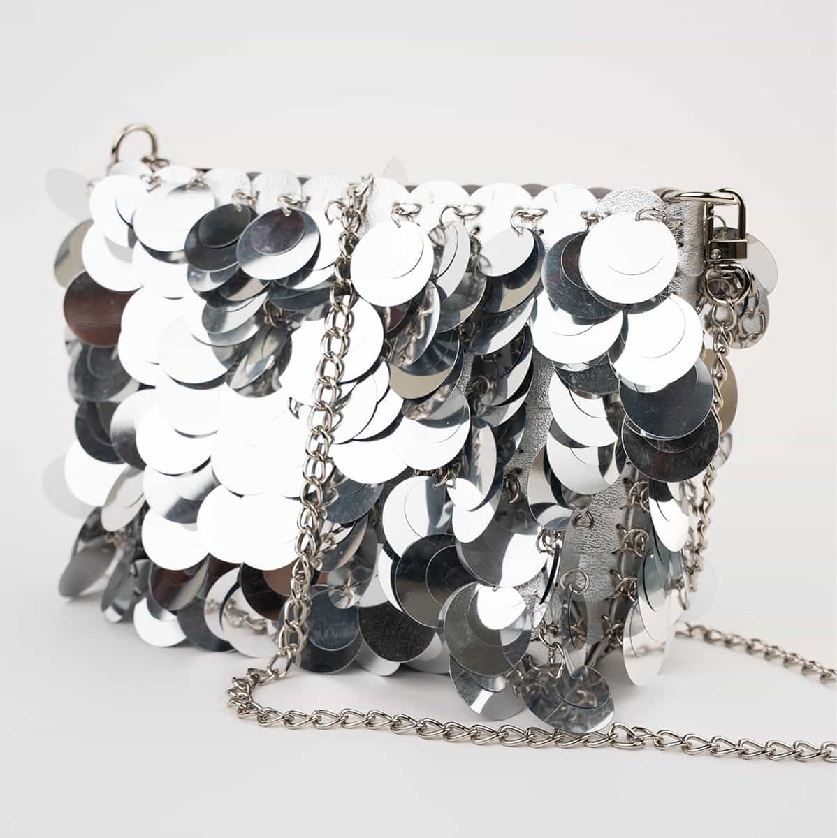 Le sac Joya en acrylic se distingue par son esprit festif et son design spectaculaire .Son format mini rectangulaire est entièrement orné de disques métallisés dorés façon sequins oversize,qui créent un mouvement scintillant à chaque geste.Il se ferme par une fermeture zippée dorée sur le dessus et s’accompagne d’une chaine fine amovible pour un porté epaule ou croisé.A l’interieur le sac est entierement doublé en polyester et comprend un compartiment principal pour vos essentiels de soirée.